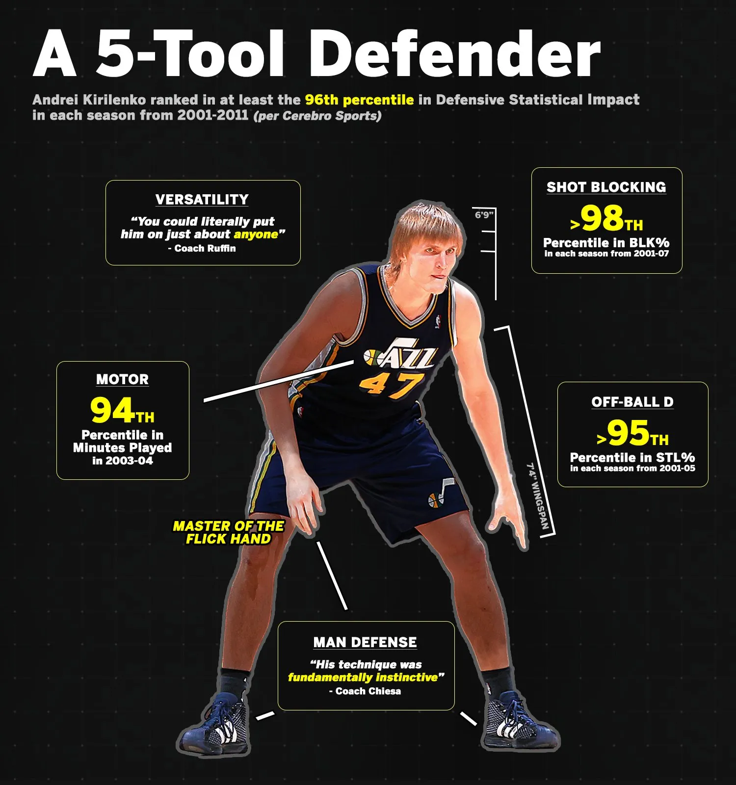 At his peak he averaged 2.8 blocks and 1.9 steals per game—one of the few forwards ever to threaten both categories at that level—and he did it without needing the ball. In the playoffs his scoring dipped to around 10 points a night, but that’s fine for my system. Stockton and Gasol can manufacture offense while Kirilenko finishes cuts, runs the floor, and keeps the ball moving.