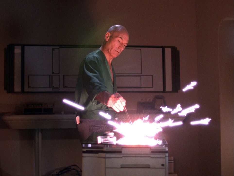 Starship Mine is a pretty enjoyable episode by comparison. The Enterprise needs to get rid of its beryon radiation, so the ship is evacuated as the scan to remove it is lethal. Picard goes back to the ship to get his saddle and stumbles into the plot of Die Hard! It’s the captain of the flagship against a cadre of thieves against the backdrop of a lethal beam that is is slowly sweeping the ship.