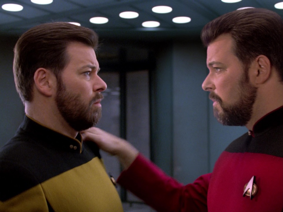 Unfortunately Second Chances isn’t really any better than its predecessor. It’s a Riker-centered episode and again, mediocre. The Enterprise is returning to a planet Riker once visited to retrieve some important data that didn’t make it off-world. There is a distortion field that prevents all transporter access for years at a time, so Riker, Data and Worf beam down only to find another Riker! Turns out he’s just as much Will as the guy who’s been serving on the Enterprise all this time, except he’s been trapped on a planet by himself for the past eight years, and he’s still got the hots for Deanna.