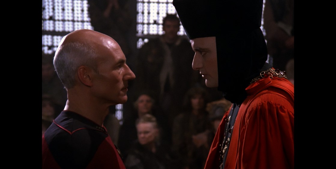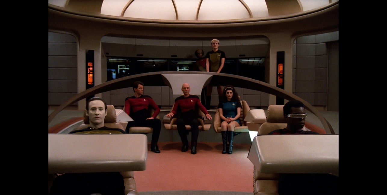 Favorite Scenes: One of the best scenes involves a cameo of DeForest Kelley, playing Bones as a retired 137-yr old admiral. It’s just him and Data, and the nostalgia in this scene can be felt; you really get a sense that the torch is being passed here. The scene where Picard and Q are facing off in the courtroom scene is also enjoyable and does work because we get to see actual drama between two actors who know exactly what they’re doing.