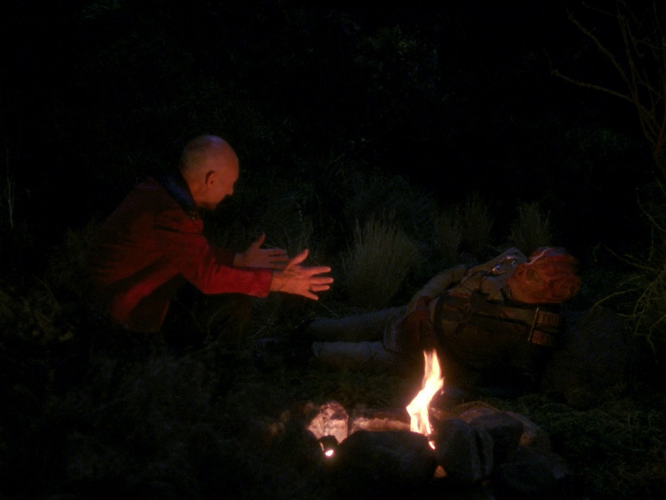 Favorite Scenes: Even the teaser is nice in this one. Just about everything that takes place on the planet is terrific, but especially when the Beast is attacking. The combination of danger, Picard’s sudden understanding, and the frustration of being transported at the worst moment ever is outstanding. Picard’s retelling of the epic of Gilgamesh is another favorite scene from the planet. I admit, I actually went out and bought a copy of The Epic of Gilgamesh and read it some years later because of this episode. The climax after Picard is transported back to the Enterprise is a great finish.
