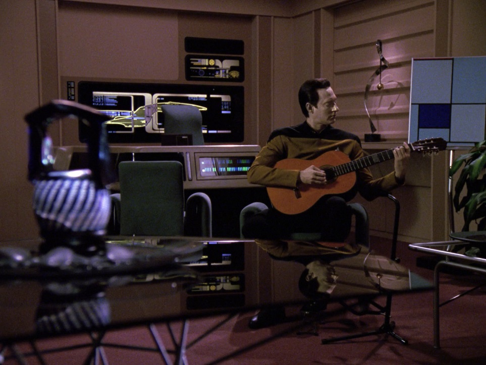 Not many know that the Enterprise got a new version of its dedication plaque for season 5. It’s first clearly seen in this episode at about 9:19. The matte painting of the ravaged world Riker and company were on is the same one used in The Survivors. While this episode’s title may be the worst in the history of Star Trek, it’s made even worse by what producer Jeri Taylor says was it’s intended meaning: “a repository of knowledge”, referring to Data! Does anyone think the title refers to Data? Finally, this is one of only four times Data uses his voice to imitate others.