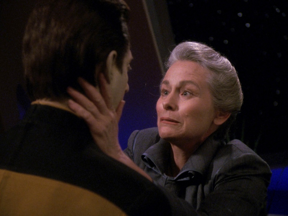 Favorite Scenes: The initial scene with the CE attacking the colony is pretty cool. Dr. Marr learns Picard wants to communicate with the CE and she is stunned that he wouldn’t want to immediately kill that “monster” and they have a little confrontation in his ready room. There’s another scene about 36 minutes in where Marr asks Data to speak in her dead son’s voice. Watching that scene, and her well-acted reaction to hearing his voice, gives you a good clue about how obsessed and unhinged she really might be.