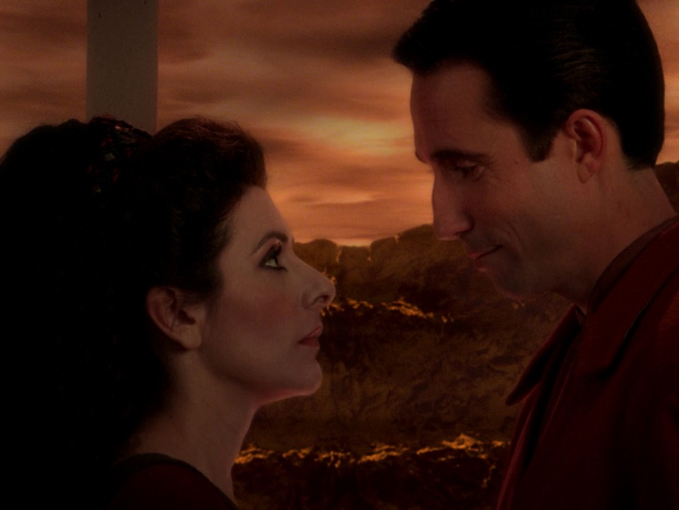 Plot A and B Analysis: The teaser gives us some information, just enough to tease us! A stellar core fragment is heading toward an inhospitable planet, which to their surprise holds a human colony inside a completely sealed biosphere. The colonists know about the approaching fragment, and with great reticence allow an away team to beam down. Plot A is about the colony and the approaching fragment, the nascent plot B is a burgeoning attraction Troi has to the leader of the colony, Aaron. We learn this colony is a genetically engineered society, inextricably intertwined with all forms of life in it for the last eight generations, and cannot leave without irreparable damage. One of their genius physicists has an idea to move the core fragment by developing a multiphasic tractor beam, and Aaron allows her to visit the Enterprise. They solve the problem and save the colony, but there are new issues. The isolationism of the colony is threatened: some want the ship gone while others want to leave and join the Federation. The episode moves along at a sedate pace and ends on a bittersweet note: the colony is physically saved, but perhaps irreparably damaged in the process.
