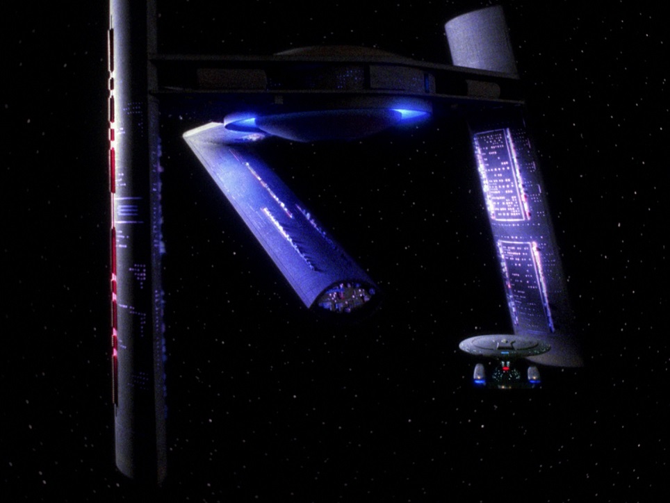 For all the previous times we’ve seen a somehow unknown Satarran warship see my nitpicks above. The Lysian destroyer was previously the Talarian warship from Suddenly Human, flipped upside down. It was nice to see the horga’hn from Risa that Riker plays with in his quarters, it’s the one Picard gave him after Captain’s Holiday. This episode is the last (of only four episodes) where Picard’s ready room is seen from the outside. It’s too bad, I liked that shot. The Lysian Central Command is a re-use of the Edo god from way back in Justice, which I’ve always thought was cool-looking. The quick tune that Riker plays in his quarters on the trombone is the exact same song he played in 11001001, which I think is a nice touch. Finally, this episode won an Emmy for Special Visual Effects.