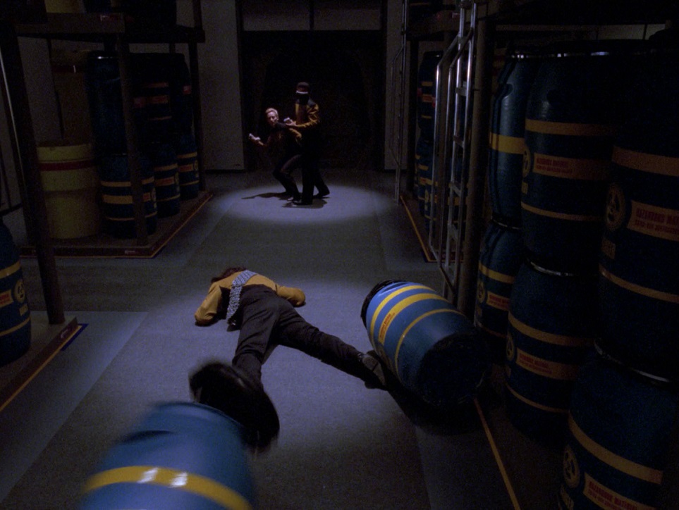 Behind the Scenes/Trivia: We learn that Geordi can see through playing cards if they’re transparent to infrared light. We also learn that almost every Klingon organ or system as a redundant backup, in case anything goes wrong with the original. Kinda ironic when you remember this is actually the second time Worf breaks his neck, the first was back in Transfigurations. The ritual suicide knife Worf uses here is the same one he used to attempt practically the same thing back in Night Terrors. The containers that fell on Dorn’s stunt double were Styrofoam. Riker makes references to The Bonding and Skin of Evil when listing off crew mates they both know who have died. It’s interesting that in Sons of Mogh Worf gets arrested by Odo and berated by Sisko for trying to do the same thing for Kurn that he asks Riker to do for him. Finally, the reason Levar’s face is so poorly lit is because he’s growing a beard that we will see in the following episode!