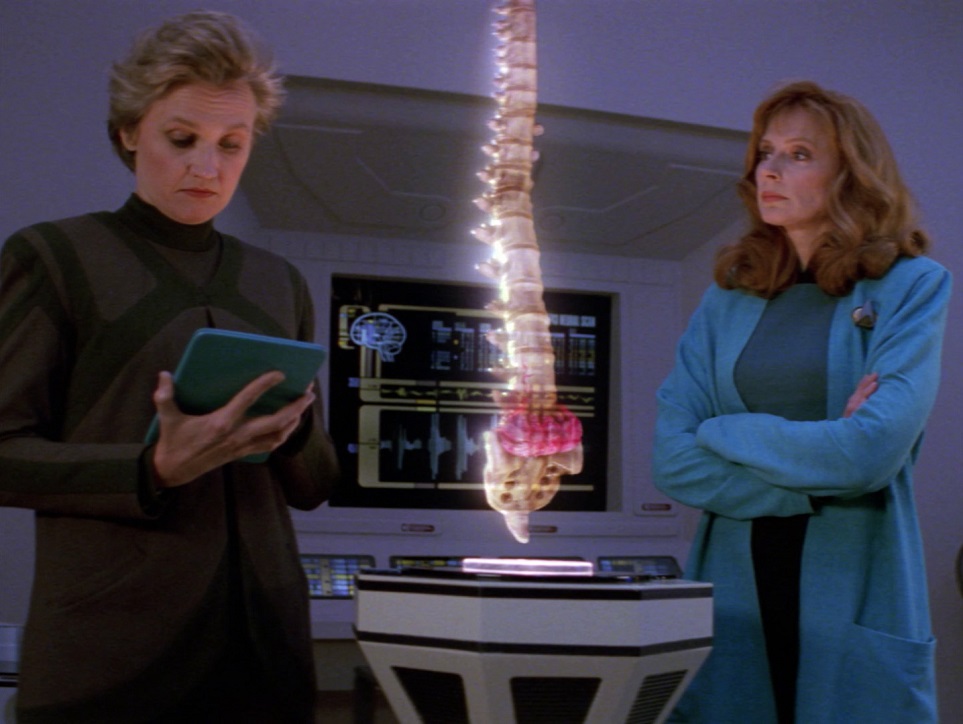 Plot A and B Analysis: The teaser gets right to the point. Worf and Geordi are investigating the cargo bay for some unusual readings, and one of the heavy shipping containers falls off a high shelf, landing on Worf’s back and making him a paraplegic. Plot A is about Beverly and Dr. Russell’s attempt to heal Worf, plot B is about Worf’s request of Riker. Russell, a neurological specialist, arrives to see if anything can be done to help Worf but Beverly thinks it’s impossible. Worf asks Riker to assist him in a ritualized suicide, called the hegh’bat. Russell wants to use an experimental technology called genetronic replication to regrow Worf’s spinal column, but the success rate is only 37% and it’s never been tested on a person. Beverly says no. Russell brings the genetronic option to Worf anyway, and later instead of using conventional medicine on a victim of a Cardassian mine uses one of her new drugs and he dies. Beverly likes her even less. Picard convinces Beverly to give the procedure a try anyway, and Riker comes up with a good solution to Worf’s request–Alexander has to be the one to do it. Partly because of this Worf decides to agree to the procedure. The plot moves at a sedate, deliberate pace until the plot resolves is a somewhat predictable fashion.