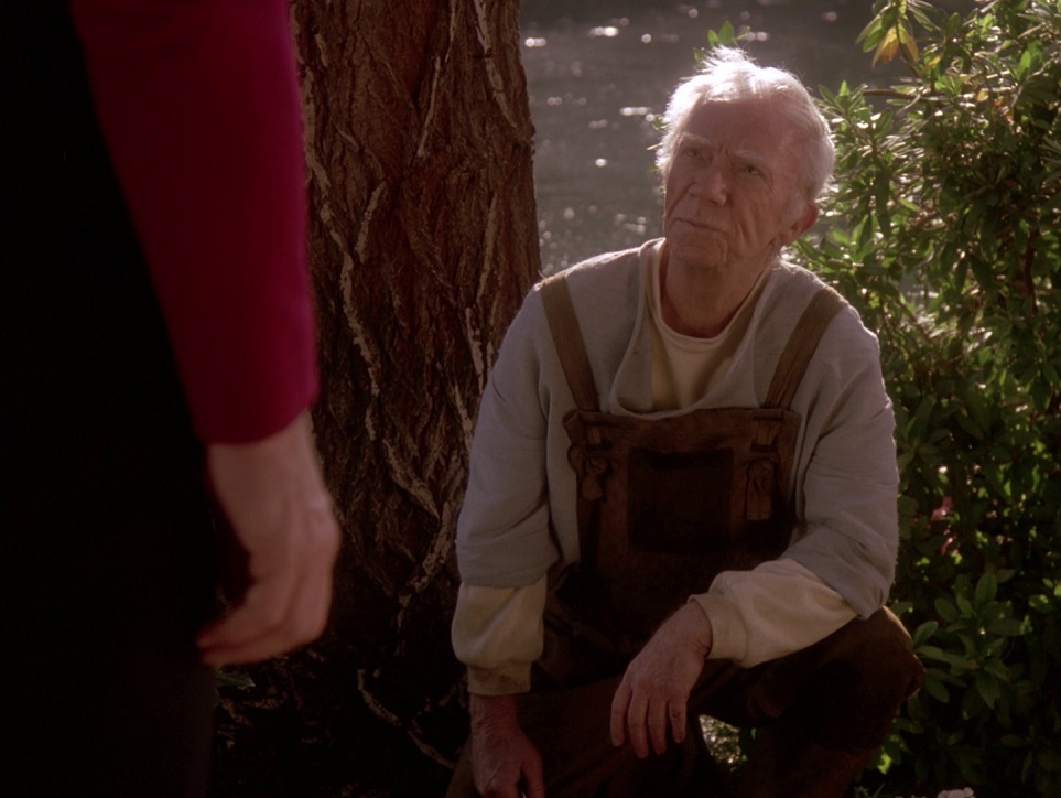 Use of Cast/Characters: Picard gives a wonderful, subtle bit of acting in the teaser right after Admiral Brand at 1:37 where she says she knows he’s close with the Crusher family. Watch his expression change, just enough so the audience can detect it. Picard’s main job this episode is to try to convince Wes to do the right thing. Riker and Deanna and Worf are in this episode but you’d hardly know it, they are only in the teaser. Data and Geordi have about the same, which is one scene where they tell Picard their discoveries about the accident. Beverly has a few scenes, which feels about right. This episode belongs to Wil Wheaton and he turns in a fine performance as a young man who has done something and is not sure what to do about it. There’s a nice reaction he has in the 7th minute, when Picard and Beverly visit him at the academy. They ask how he’s feeling, and his response is, “Not bad, the arm’s a little sore.” The way he says it then turns and walks in sets the tone for the scene. They just become parents visiting a son in his dorm room, people he’s completely comfortable with. It doesn’t last long, but I like it. He will only appear two more times in the series, both in season 7. Boothby is portrayed by the terrific Ray Walston, and his character has twice been referred to: first in Final Mission, and more recently in The Game. He does a great job. Frankly so does Robert Duncan McNeill as Nick Locarno, who is first rate. The rest of the guest stars are just okay, with the notable exception of Ed Lauder who plays Josh’s father Albert, in a memorable scene.