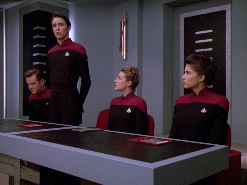 Berman agreed, on the condition that a maximum of three sets be used. Ron Moore had a huge disagreement with Michael Piller (the head writer) about how this episode ended. Ron insisted Wesley would never betray his friends, and Michael said this is about Starfleet, about the truth, your word. Ron’s counterpoint was what about your friends, you make promises to them too! He had a different ending in mind, but I’m glad they shot the ending the way they did, Piller was right.