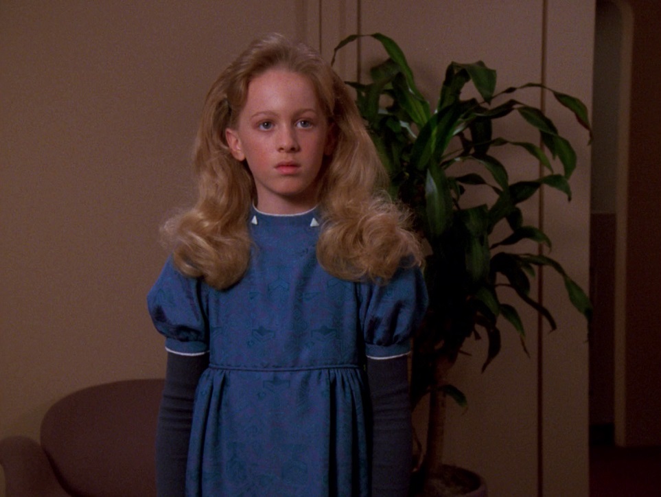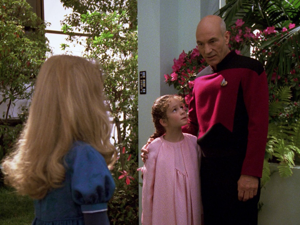 Use of Cast/Characters:  Picard, Riker, Data, Worf and Beverly don’t have much to do. That’s not a great sign. Geordi gets a bit more character development, as we learn his father was an exozoologist, his mother a command officer. Guinan is in this episode briefly, and gets about the same, talking with Clara about her own childhood imaginary friend–a razorbeast–and having a brief conversation with Deanna. Deanna is pretty active in this episode, and does some psychologically valid things, but this episode isn’t centered on her. Noley Thornton plays Clara and actually does a good job for a child actress, I think she’s talented for a kid–her scene in the arboretum in the 29th minute is pretty authentic. Shay Astar is Isabella and does a less good job. Watch her one expression for the entire episode, then be generous and blame the director. Brian Bonsall is back as Alexander in a scene where his clay gets smashed. Aw.