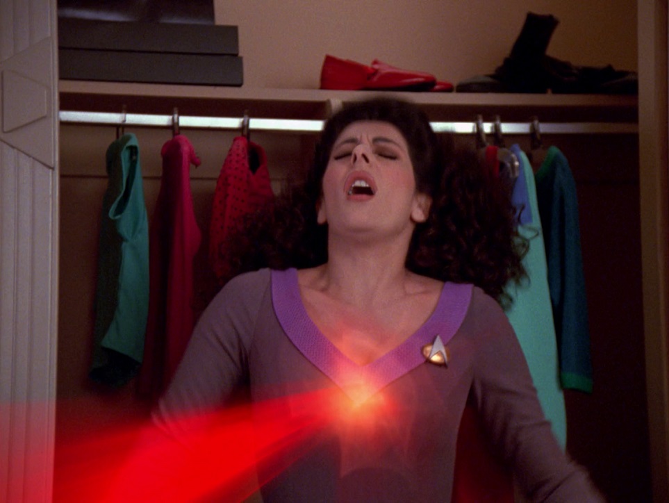 Behind the Scenes/Trivia: Episodes involving energy aliens coming on the ship have been occurring since the first season: Lonely Among Us, The Child, The Bonding, Power Play, and Cost of Living. This one is tied for the weakest. This is one of only three episodes in which we see the arboretum, the other two being Data’s Day and Dark Page. You will see Noley, who plays Clara, in the DS9 Episode Shadowplay. Brannon Braga, who ended up being responsible for most of the script called this episode his most satisfying episode in season 5. What?! What’s worse, he chose to develop this story instead of doing a Q episode this season. What?!?