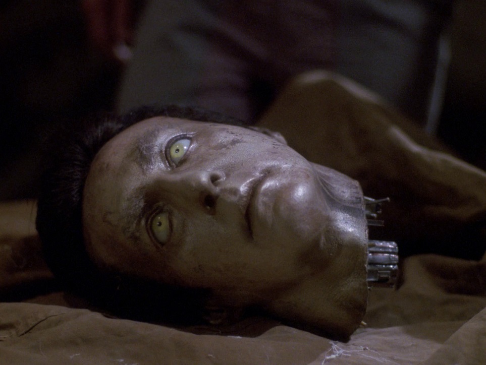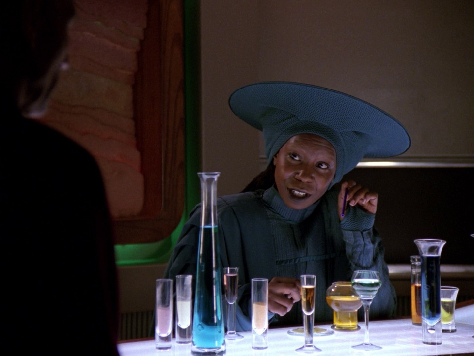 Favorite Scenes: Some scenes are provocative, and seeing Data’s severed head for the first time is one of them. Guinan and Picard’s talk at around the half-hour mark is another, and I will quote from it. She tells him he has to accompany the next away mission to the planet, and Picard is surprised: