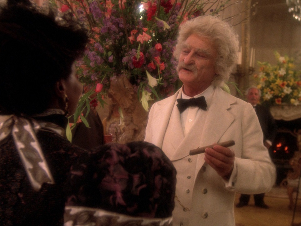 Behind the Scenes/Trivia: Deanna quotes Data’s definition of friendship, which he gave way back in Legacy. The date that Data arrives in the past is August 13, 1893, as we read from the newspaper. Originally season five was not slated to end in a cliffhanger, however the shadow of DS9 was beginning to loom large, and there were rumors TNG would be ending. Berman and Piller decided to make it a two-parter so fans would get the message TNG would certainly continue. You may not recognize Marc Alaimo as the poker player in the 22nd minute. This is his fourth TNG appearance. The previous three were in Lonely Among Us, The Neutral Zone and The Wounded. Jerry Hardin, who plays Samuel Clemens, was previously seen prominently in When the Bough Breaks. Hardin loved playing Mark Twain so much he’d go on to create a one-man show about him! Brent Spiner and Whoopi Goldberg have both stated they really enjoyed this two-parter.