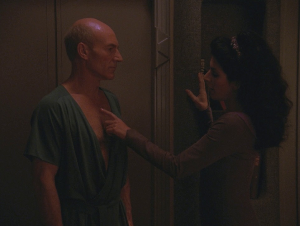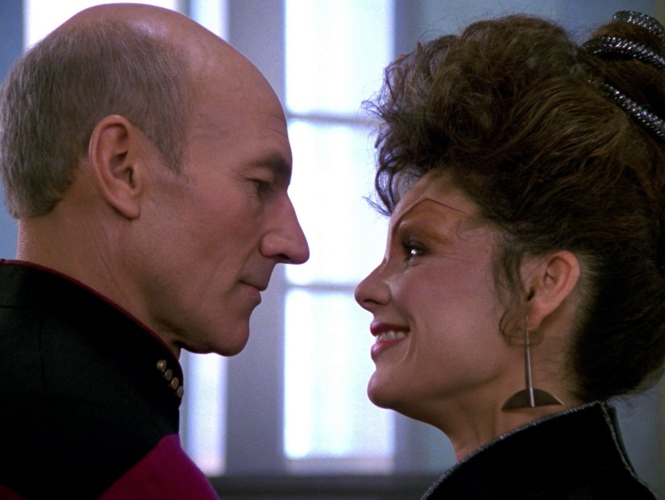 Favorite Scenes: The scene where Ardra first appears and puts on her show is one of the better ones in the episode, I like it. The conference room at the 16- to 18-minute mark is a excellent example of how Picard organizes a plan to deal with each aspect of the dilemma they are facing. He involves his officers, breaks down what we’ve seen in the previous scene involving Ardra and gives everyone something productive to do. Finally, the moment in the seduction scene where Ardra invokes Deana to entice Picard is cool. I frankly have a pretty good time watching every scene Ardra is in, she’s a wonderful guest star.