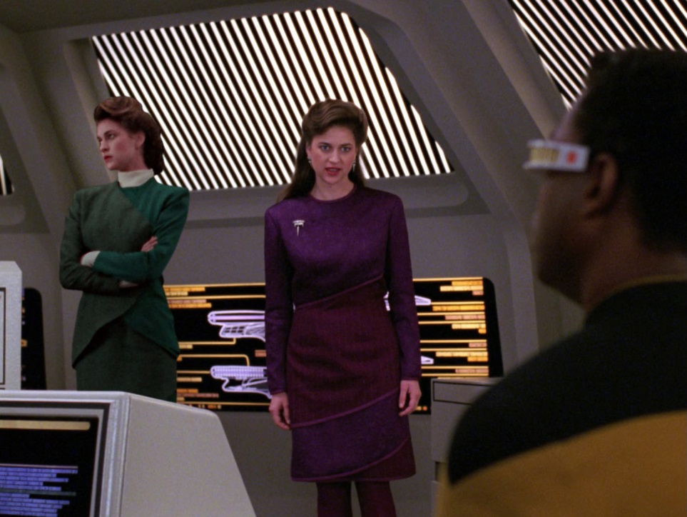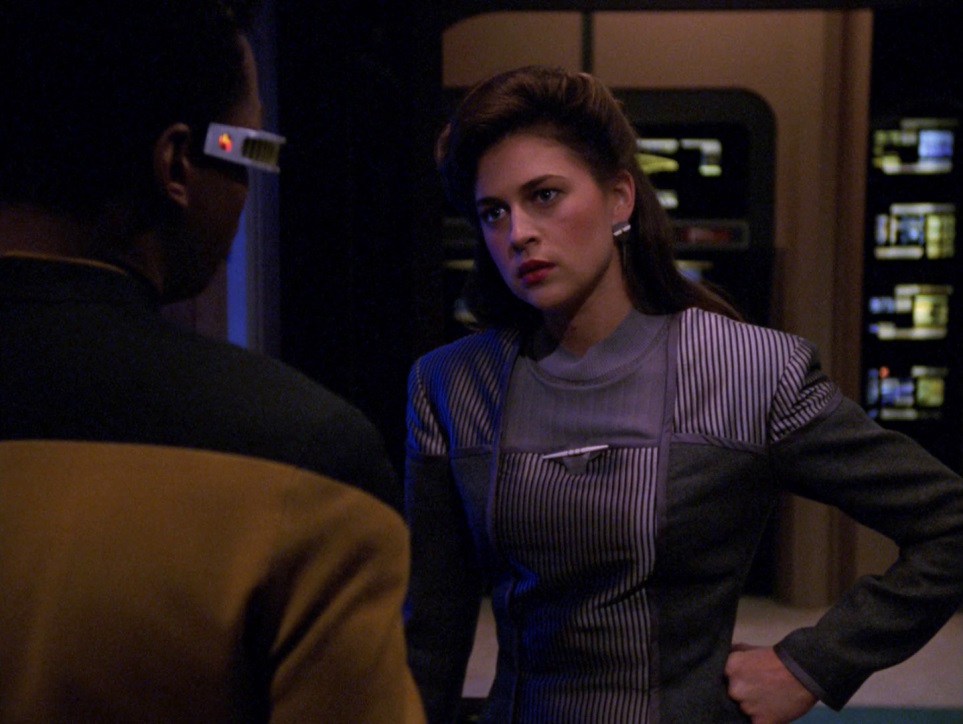 Plot A and B Analysis: The teaser promises that Geordi is in for a rougher ride than he thought. The Enterprise is headed toward a starbase to, among other things, pick up Dr. Leah Brahms. A chief designer of the ship’s engines, Geordi is excited to meet her because he simulated her on the holodeck back (falling for her in the process) in Booby Trap. He is positive they’ll get along swimmingly so of course the first thing she says to him is, “So you’re the one who’s fouled up my engine designs.” Pretty bitchy! Plot A is about the galactic baby, plot B is about the La Forge/Brahms drama.