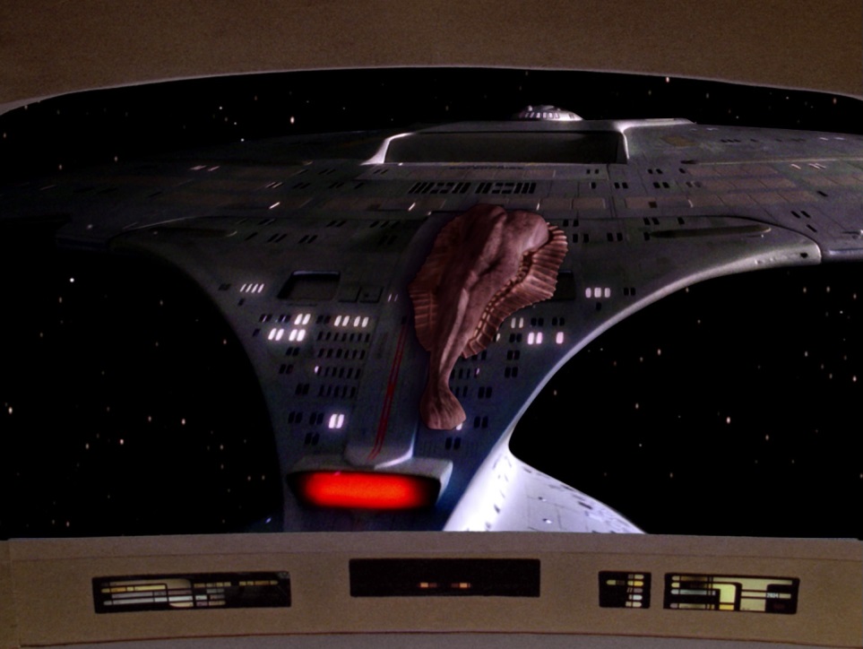 Behind the Scenes/Trivia: The use of CGI is prominent in this episode to a greater extent than Datalore. The initial shots of the space life form is a physical model, but anything that shows movement is CGI. The idea for what the space baby should look like evolved quite a bit; originally it was going to be even more plankton-shaped. The title of the episode refers not just to the baby, but also to the Enterprise being a Galaxy-class ship, and it thinking the ship is its mother. The large schematic of the Enterprise is visible, along with all of the in-jokes on it as well, which I refer to specifically in my review of Brothers.