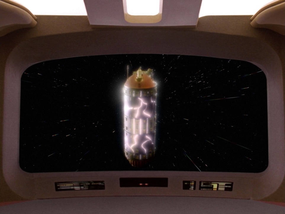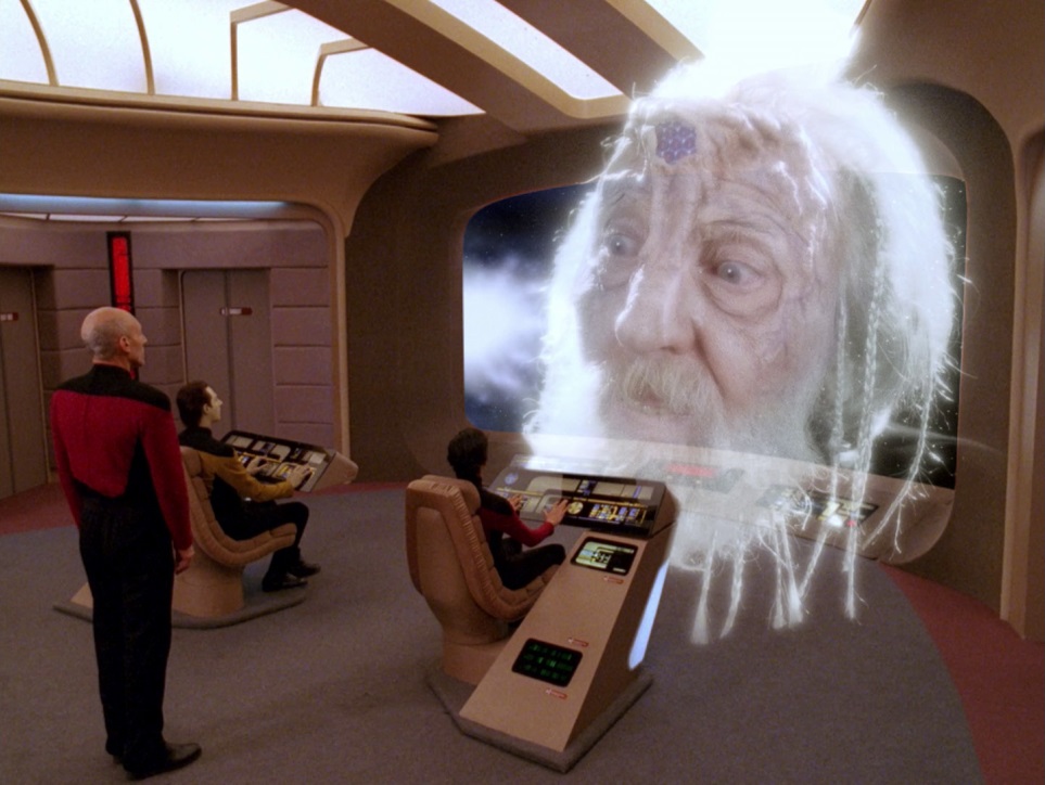 Nitpicks: In the 27th minute, why does Riker tell Worf to start a red alert? He’s just been saying ‘red alert’ himself for the entire series! I wish the Enterprise could have kept that 300% increase in shield power. Seems like everything he did would have been logged and be replicatable, even if it might have made the ship a little too uber. Finally, when they arrive at the center of the galaxy, what about Sha Ka Ree from Star Trek V, also at the center? It had only come out two years previous to this episode.