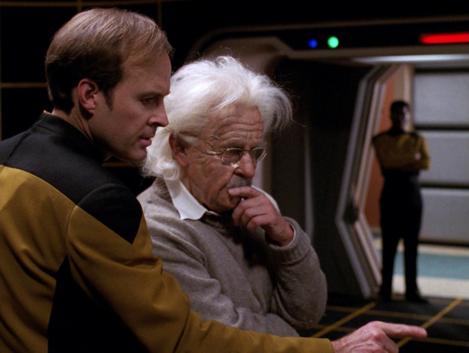 Plot A and B Analysis: The teaser is one of the longest ever and has two parts, both of which are good. The first has Barclay portraying Cyrano from the eponymous play, and acting in pretty godawful fashion. The second has the Enterprise arriving at the Argus Array, a big telescope that stopped transmitting two months previous. They find a probe, and when Geordi and Barclay take a shuttle out to investigate it flashes and knocks Barclay out. Plot A is about Barclay’s mental odyssey, there is no plot B. Barclay wakes up with no apparent ill effects, but meanwhile the probe starts acting up, following the Enterprise and threatening to overload its computer with all the energy it’s putting out. Nothing the crew does can affect it until Barclay magically increases the shields by 300%! Then they blow the thing to kingdom come. A whole slew of unusual behavior follows: offering to solve a complex problem in record time, showing utter brilliance as an actor, arguing grand unification theory with Einstein, etc. A crisis occurs and Barclay takes control of the computer to save the array and the Enterprise, but now there’s a problem: he’s expanded his mind into the computer and can’t be separated without dying. Then he decides it’s best to take control of the ship. The plot here is well-paced, enjoyable, and unpredictable. It’s a fun ride from beginning to end.