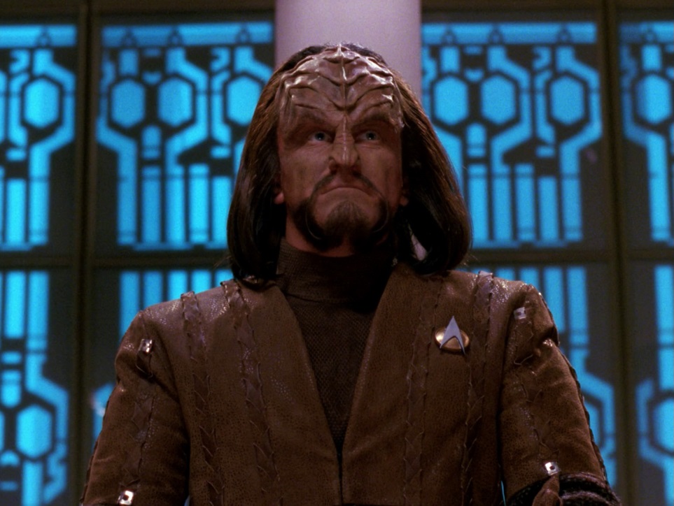 Overall Impression: This is one of those rare episodes that gets better the older you are. I worry that people underestimate this episode, because it’s one with eminent applicability to our lives today, and one of the most relevant episodes in all the Star Trek canon. There are echoes of McCarthyism (“why do you hesitate to give us the names?”), and the exchange with Worf has implications today toward the war on terror, as well as the ultimate price we have to pay to live in a free society: eternal vigilance. Not giving in to fear. I also like the reminder by the writers about how using a guarantee (to not answer a question that may serve to incriminate yourself) from the US’s own constitution can be used against people who are on trial and invoke it. Then there’s the matter of judging a man because of the blood in his veins, or his ethnicity. As I’ve said before, episodes like this are one of the reasons I love Star Trek above other sci-fi. I rate this episode a very solid 4 out of 5 stars.