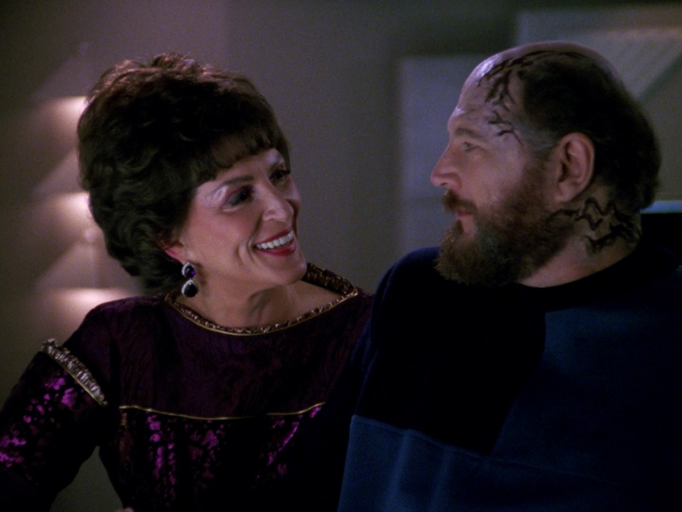 Makes me wonder what Majel Barrett had to deal with being married to Gene Roddenberry, who Marina Sirtis and others have referred to as a “dirty old man.” Another scene that occurs later has stuck with me. Lwaxana and Timicin are debating his world’s policy, he characterizes the deaths of those turning 60 as a benefit, passing on the responsibility of life from one generation to the next. The whole conversation is maybe the best scene of the episode: