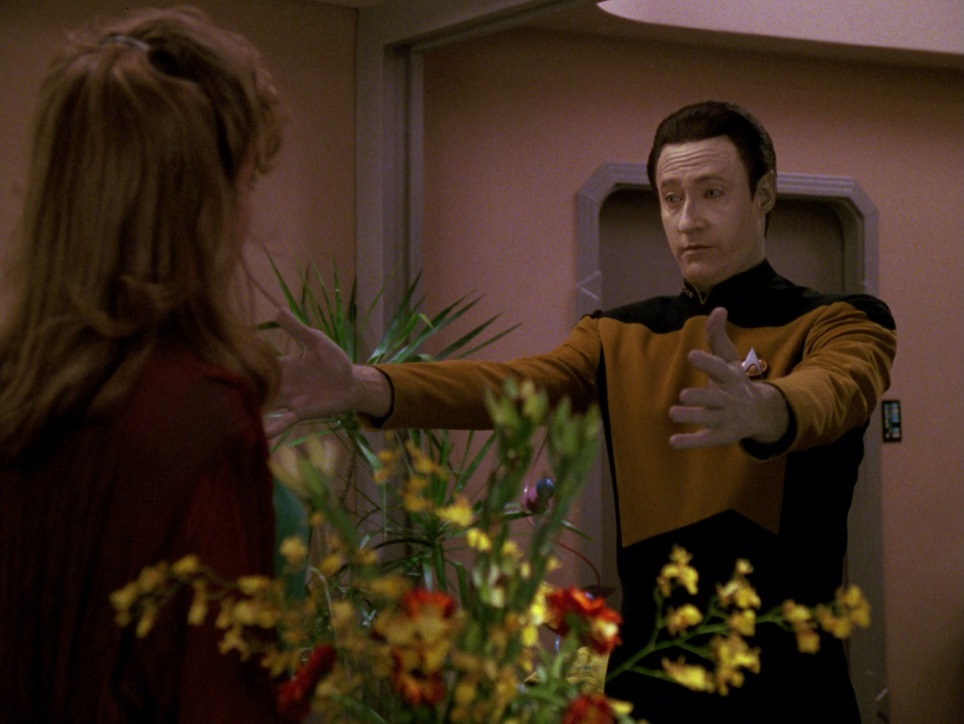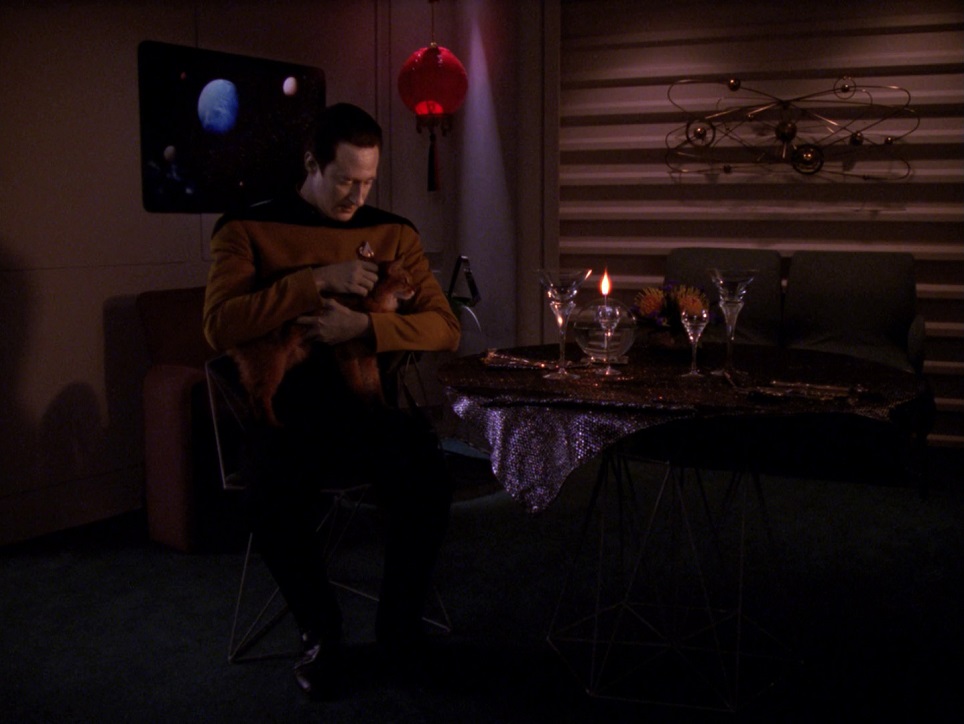 The best scene in the episode starts around the 28th minute, with Data trying to be a dutiful and solicitous boyfriend. The whole scene is hilarious, and is one of the funniest scenes in the entire series.
