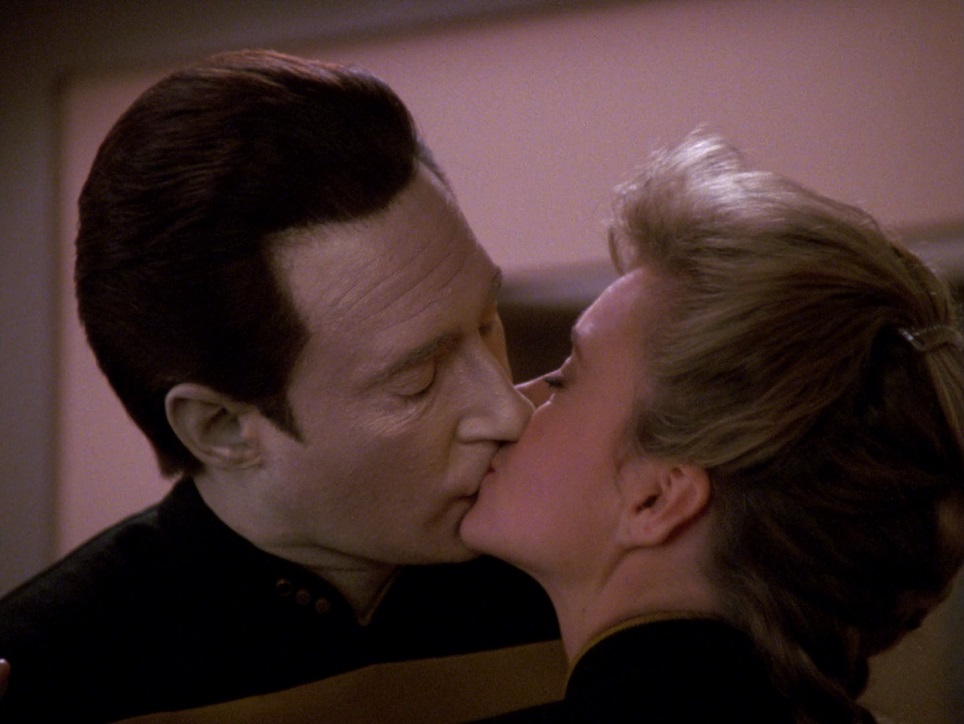 Favorite Scenes: There are multiple funny little scenes in this episode, well worth watching, most of which are due to Brent Spiner. For example, Jenna is telling Data a story about her childhood and he gives a classic ‘Data’ response, which somehow results in her kissing him: