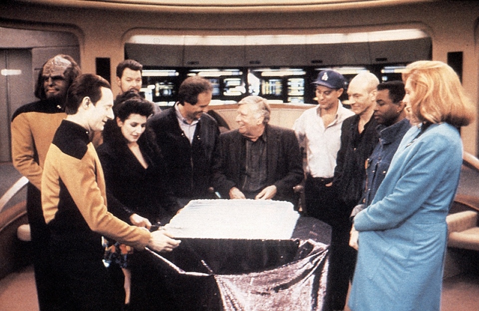 The cast and Gene Roddenberry celebrated this as the 100th episode of the series. Here’s a pic of the cast and crew celebrating. And yet I’ve named this the 99th episode, how to reconcile this apparent contradiction? I give a full explanation during this section of my review of the episode Legacy, where there was a related issue. Sufficeth to say this is the 99th episode, but the 100th production hour of TNG given that the pilot was two hours long. The actual 100th episode is the first episode of season five.