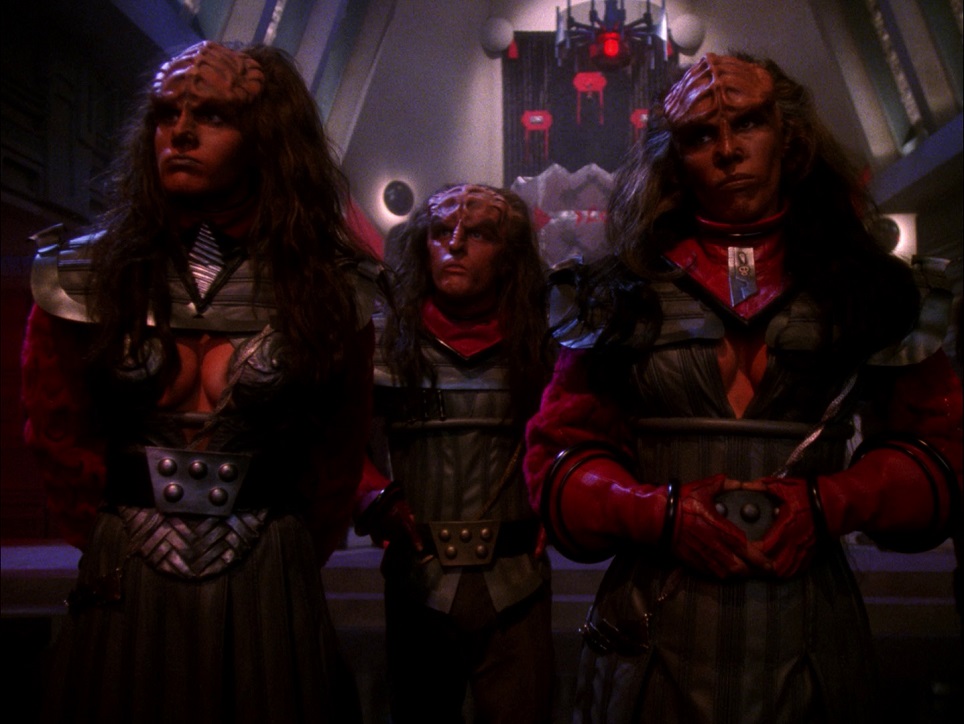 Use of Cast/Characters: This episode is clearly about Worf. He finds a way to regain his family’s honor, gets Picard to help him some, and directly influences the succession of the Klingon Empire. Not bad for a guy whose character was an afterthought when the series started! As in Reunion, Picard has to walk a tightrope here. The Prime Directive is all about non-interference in other worlds and cultures and his job has been not only to arbitrate succession of leadership of the Klingon Empire, but sort out his own sympathies with Worf as well as a possible fundamental shift of power in the quadrant should Duras’ family lead the high council. Then he has to pull the ship away while Worf is on a ship under attack. The question is later put to him, should the Federation join Gowron in fighting Duras–with very persuasive arguments–and he makes a risky decision with heavy consequences. The crew of the Enterprise are more than just the best in Starfleet, they are power brokers in their own right! Riker and Data have only a few lines while Geordi, Beverly and Deanna don’t have any at all. Guinan has a nice little scene with Worf, which I think serves the purpose of reminding him he is still learning what it is to be a Klingon, and that’s OK; it’s also a factor in Worf asking Picard for a leave of absence. Robert O’Reilly and Tony Todd do their usual good jobs as Gowron and Kurn. Barbara March is great as Lursa and Gwynyth Walsh is nice as B’Etor as well.