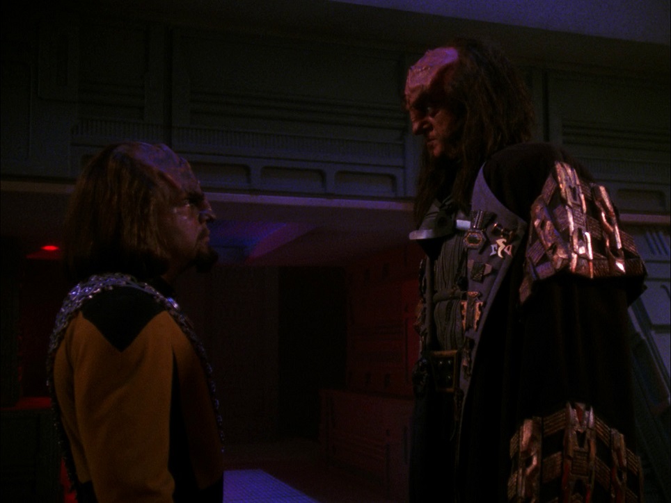 Favorite Scenes: This entire episode is packed with good stuff. A key scene happens about 14 minutes in, when Worf meets with Kurn on his ship. Kurn tells Worf he won’t back Gowron or Duras; he has made a plan with other leaders to overthrow the council and install a new one. He asks Worf to join him. Worf says no, that Klingons cannot gain honor by acting dishonorably. Kurn doesn’t like this but Worf convinces him to back Gowron, and the price of their support will be the restoration of their family honor.