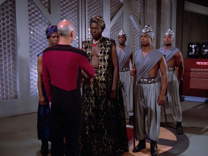 Plot A and B Analysis: The teaser sets up our plot: the Federation needs to acquire a vaccine that only the folks on Ligon II have, and the Enterprise is there to negotiate for it. The Ligonians beam to the cargo bay for some reason, and one of the sexist suckers challenges Tasha only to have the smack laid down, and finally their leader seems interested in using her for some purpose. Plot A involves the Ligonians, Yar and the vaccine, there is no plot B. It doesn’t take long before we see how the Ligonians (who are all Black) are going to be portrayed. “A woman? In charge of security?!” They look like they’re straight out of a 40’s representation of tribal Africa and we’ll see them as backward barbarians for the entire episode: these dudes literally have spears as weapons and are wearing turbans. Code of Honor has a lot in common with the original series episode “Amok Time,” which features a ritualized combat scene and a death. Yay, another episode which is imitating TOS. The vaccine has the magical quality of being non-replicatable, so now it’s an obvious “justify the plot” device. The plot progresses and the Ligonians’ culture is further confused: first they’re like the ancient Chinese, then once they kidnap Yar they’re like the Native Americans. They don’t seem to respect women though: “We understand that they are highly pleasant things. But after all, unimportant, except for the land they own.” This episode does, however, hint at how the Prime Directive works in the 24th century. The way that the show moves from trying to get Yar back and the vaccine too resolves itself in a kind of bizzare fashion which seems in line with the rest of the episode.