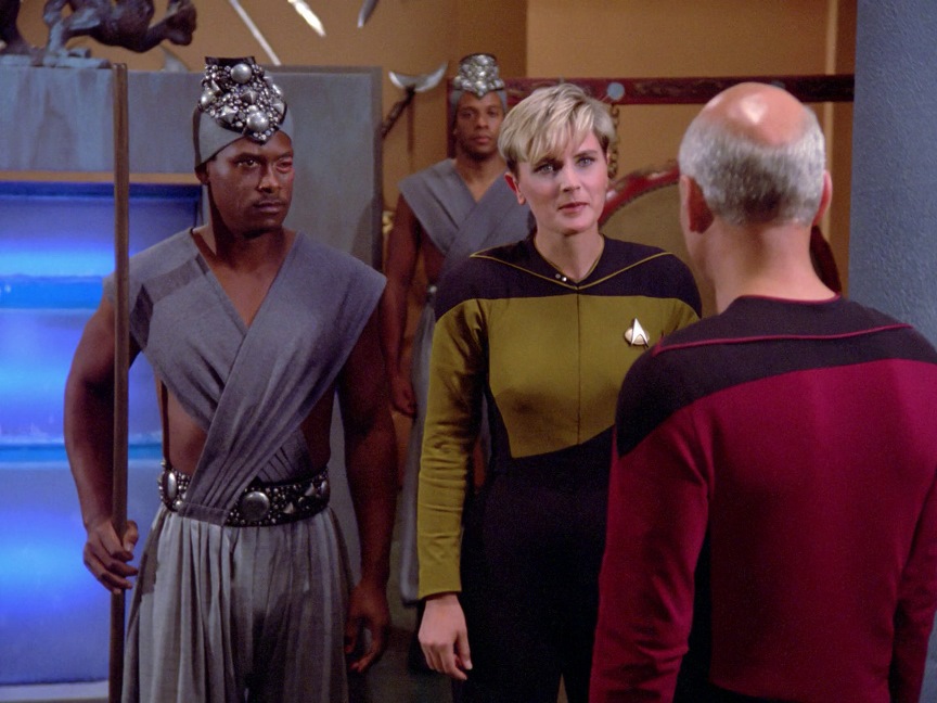 Behind the Scenes/Trivia: Look closely when you see Dr. Crusher trying to revive Yareena and you’ll see her wearing a 20th-century wristwatch for some reason? Hmm. Originally only Lutan’s guards were specifically written as being African, it was director Russ Mayberry’s idea to make all the planet’s occupants African. Disgusted by this decision and Mayberry’s attitude towards the performers, Gene Roddenberry fired Mayberry late in production. This episode shows a variation of Troi’s uniform: the gray unitard now has red belt. Dorn in an interview said how grateful he was that he wasn’t in this one, and called it the worst Star Trek episode ever filmed. Frakes called it a “racist piece of $#!+.” Brannon Braga, who joined the writing staff in season four and is responsible for several of the best episodes of TNG named this one as his most hated episode.
