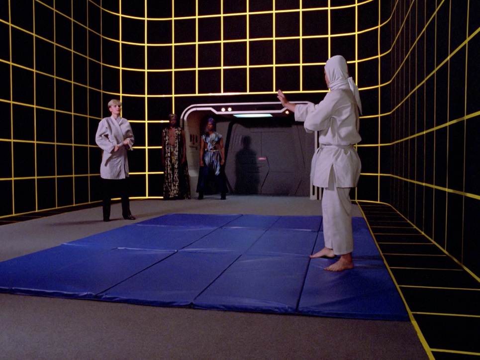 I’ll share this story here because aikido features in the episode. Denise Crosby said that during season one the producers though it would be a great idea to have Denise and Jonathan learn aikido. This would be in case they needed to flip or throw someone in some future episode, and also to exude a “warrior spirit” as they walked around. So during lunch, twice a week, they did not eat but would meet on a sound stage with an aikido master. According to Denise this master “would beat the $#!+ out of us.” He would make them flip each other also: “I could always flip Jonathan, but he could never flip me because he was laughing so hard,” and they had a great time.