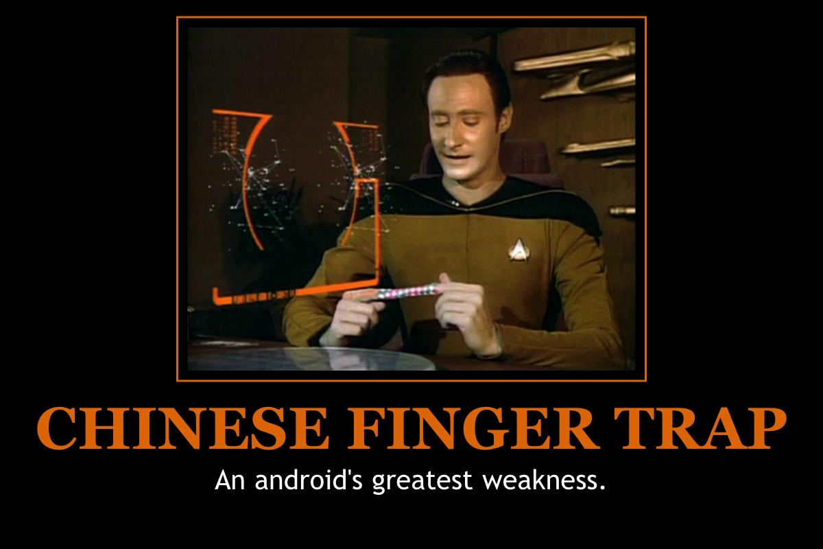 Plot A and B Analysis: This episode gives us our first chance to meet the Ferengi, mentioned back in the pilot as dangerous enemies. The initial sight of them is pretty cool: the ship is pretty impressive in design like Picard says, and since the Enterprise’s power is suddenly being drained they must have some kick-ass technology too. It’s actually a good teaser for the episode, maybe the first one that’s really worked. Plot A is the one dealing with the Ferengi and the T’Kon planet, there is no plot B for this episode. Problems set in quickly after the commercial break: Riker comes across as an impatient, demanding douche–this happens often in the first season. The plot slows down so we can hear about different countries’ flags as the French joke is attempted to be resurrected here, only to fail again. This episode does give us a taste of Geordi in engineering planning their escape, which is nice as he takes over there full-time in season 2. We also get to hear Picard swear in French, saying “merde.” I’ll let you look that one up. They have a conference, the decision of which is to–for the second time in four episodes–surrender the Enterprise. After finding out the Ferengi are in the same predicament, they go back to the observation lounge again to discuss the probe‘s findings of the planet and Data, the super-smart android, gets outsmarted by Chinese finger cuffs. They talk to the Ferengi and then everyone goes to the planet. Here is where the episode really starts to suck. First we have lines like, “Are you conscious?” “Do I look conscious?” Of course following this they’re all knocked unconscious. When everyone wakes up the Ferengi are portrayed as complete losers. They’re short, annoying, hop around like lunatics with high-pitched voices and quickly become the least threatening of just about any Federation enemy ever. What’s worse is that the ‘fight’ that follows comes across as comedy, rendering the audience incapable of taking them seriously. As ridiculous as they are Worf, Riker and Data start to lose the fight, Tasha the only one appearing competent. The last scene with Portal and Riker is alright, in that it isn’t as awful as much as most of the preceding 30 minutes.