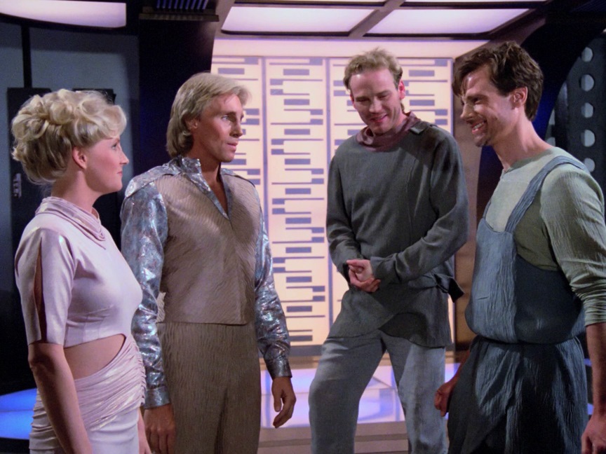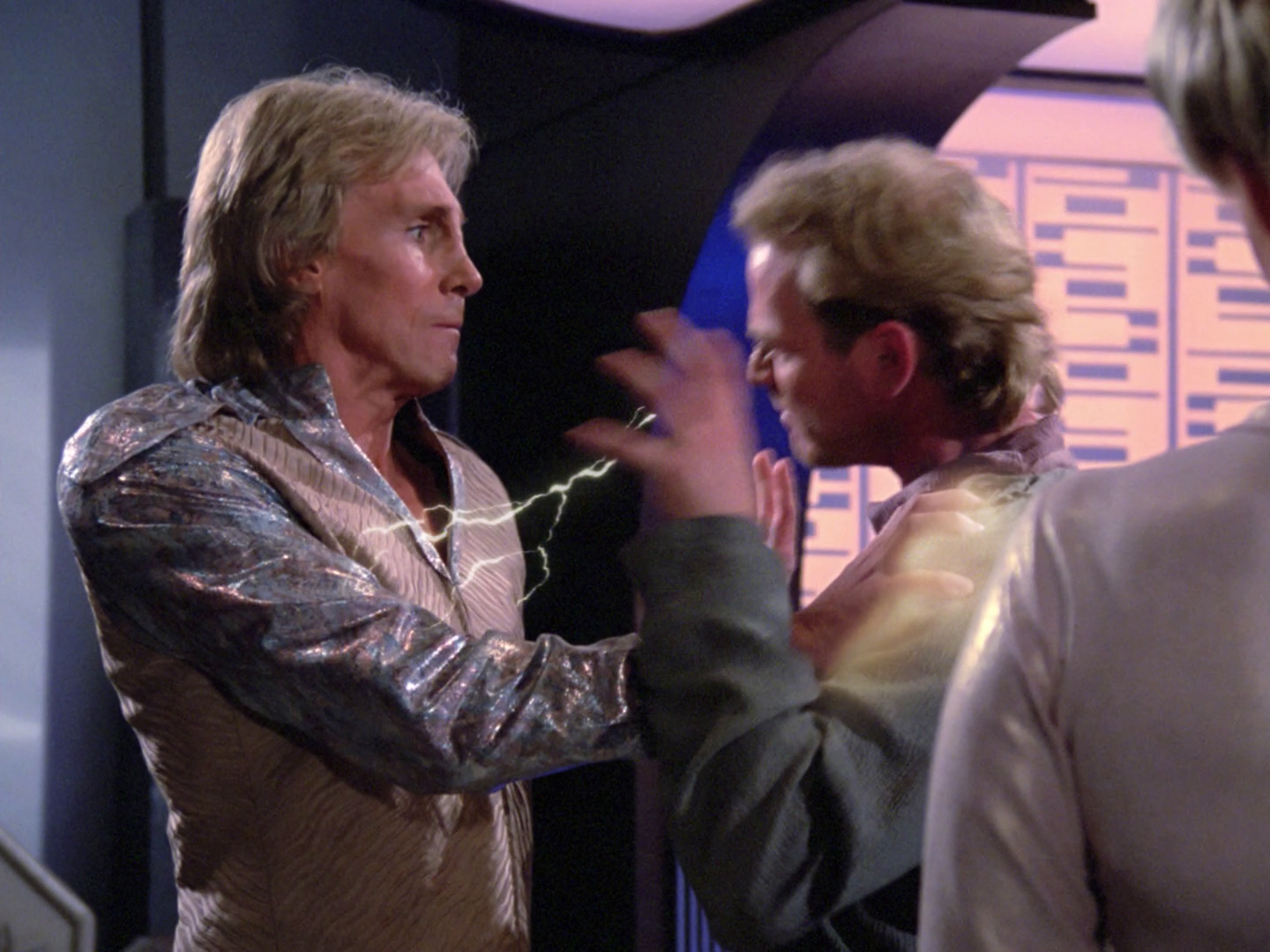Use of Cast/Characters: The character and wisdom of Captain Picard is on display in this episode. He has to walk a tightrope here in navigating what the Ornarans and Brekkians want, what the Prime Directive demands, and even with someone who holds Riker’s life hostage and he does it all very well. He holds the line and comes up with an elegant solution, and his ability to do all of these things are some of the reasons I admire him. Tasha is used fairly well here; she is professional and decisive, taking control of the fight that breaks out in the cargo hold. Doctor Crusher plays a fairly significant role in this episode: she is there primarily to represent the audience’s outrage once we discover what the “medicine” really is, and she does a good job of it. Riker, Data, Troi, Geordi and Wes all have about the same screen time and usefulness, which is marginal. Worf has the least of all, poor guy. Merritt Butrick and Richard Lineback, who play the Ornarans, are just terrific. They play every scene just about perfectly, you really feel for them. Judson Scott and Kimberly Farr, the Brekkians, do a good job as well, but I think if they were a little colder in their performances it would have paid off more at the end.