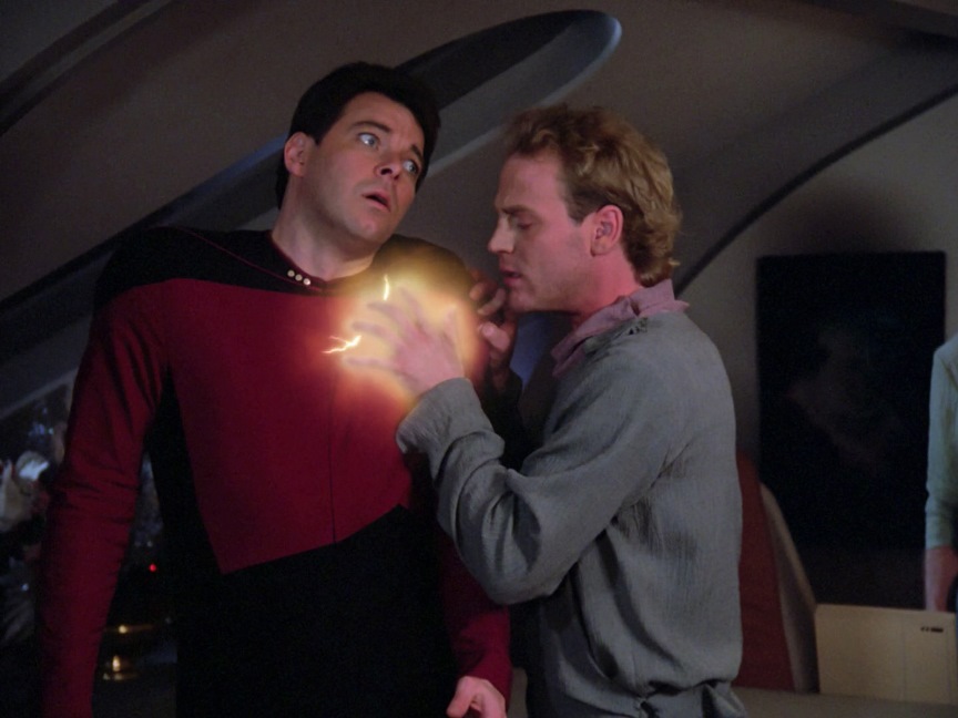Nitpicks: Wow, 30 seconds into the episode and we get a sustained close-up shot of the black cards on the back of the bridge. Also, does the captain really need to give an order to maintain a yellow alert?? Later on Riker recovers pretty fast for someone who was almost killed, I thought. Also, while the title of this episode makes some sense the relationship between the worlds isn’t symbiotic, it’s parasitic. It’s a minor quibble though.
