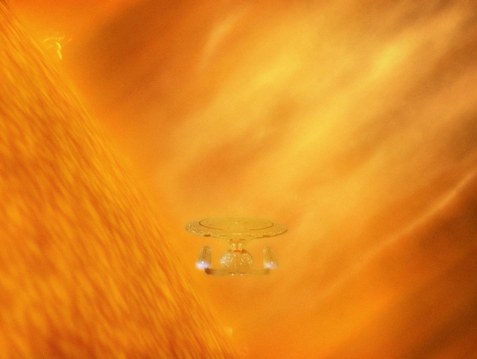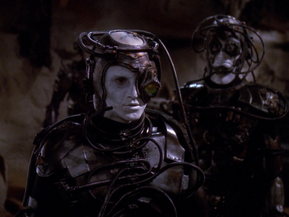 Plot A and B Analysis: In the teaser Lore seems to be some sort of cult leader with a mission: to make the Borg like he and Data, fully synthetic life forms. Plot A is about Lore, Data and the crew on the surface, Plot B revolves around acting-captain Beverly Crusher and their conflict with the Borg ship. Plot C is about Riker, Worf, Hugh and his rogue Borg faction. The first part of the episode involves Data repeatedly saying he’s not their puppet and they don’t understand, it gets repetitive. Beverly decides not to go back through the conduit and launches a message buoy, then swings back around to pick up those she couldn’t transport off the surface. Geordi tells us Lore is transmitting emotions from his stolen emotion chip to Data–only allowing him to feel anger and hatred–and has also deactivated his ethical program. Riker and Worf are loose on the planet and get caught by Hugh and his Borg! He explains how his individuality infected the Borg collective like a virus, resulting in chaos, which is when Lore came along and seemed like a savior. Beverly comes back and manages to transport the remaining survivors to the ship, but the Borg take out their warp drive. Beverly does what any good Starfleet officer would, she plots a course right into the sun! She uses a new metaphasic shield which allows them to hide next to the sun’s corona. Picard and Deanna hatch an escape attempt which fails, but he does manage to swipe a chip from a Borg, and Picard modifies it to reboot Data’s ethical program right before Data irradiates Geordi’s brain. On the Enterprise, a plucky young ensign figures out a way to make a section of the star destabilize and explode, destroying the Borg ship. In the climactic scene, as Data is taking Picard to begin experimenting on him Lore shows up and asks Data to kill Picard. Data refuses and it is then that Hugh, Riker and Worf shows up along with their rogue Borg, plunging the area into chaos. Lore escapes, Data shoots and then deactivates him. The episode ends with Data deciding to destroy the damaged emotion chip because of his actions, but Geordi intervenes and takes custody of it saying, “Maybe someday, when you’re ready.” Whew that’s a lot of plot.