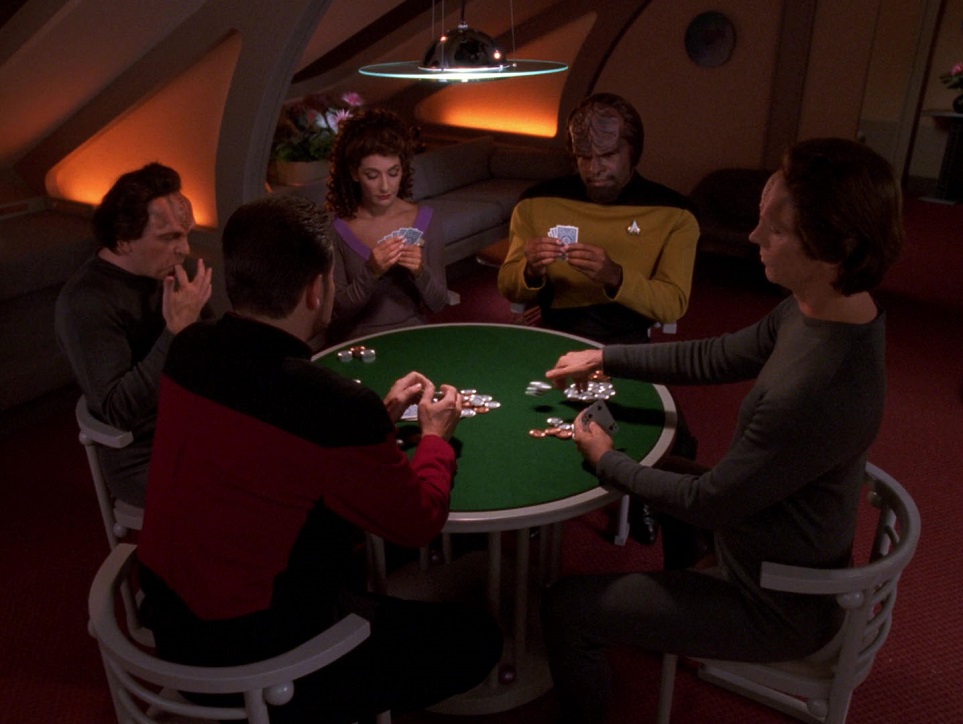 I love everything that happens at the poker game. The ambassador takes two of Worf’s chips to bet, and he’s had enough: