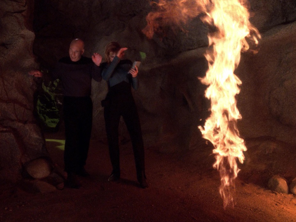 Plot A and B Analysis: Picard and Beverly are having breakfast together, talking about the world Kesprytt III applying for membership to the Federation. Only half the world is applying, the other half doesn’t want it. When the two transport down to the world we learn the beam was hijacked. Plot A is about Picard and Beverly’s time together, plot B revolves around Riker working to get Picard and Beverly back. Jean-Luc and the doc are prisoners of the Prytt, who are convinced the Kes are forming a military alliance with the Federation and have implanted them both with devices that will make their thoughts public. After being in jail for 5 minutes they are sprung by a Kes spy and escape. Riker works with the Kes to make some kind of contact with the annoying Prytt. P&C go through a lame fire spurt cave and start running through the countryside. While the Kes and the Prytt both become increasingly irritating as we realize their level of paranoia, P&C start to read each other’s thoughts. We learn they’re not only connected but tethered, they can’t get too far apart. They have a deep conversation about by a fire. Riker convinces the Kes and Prytt to cooperate enough to get his officers back, it’s clear the planet is not ready to join the Federation, and the episode comes to a rather unsatisfying end.