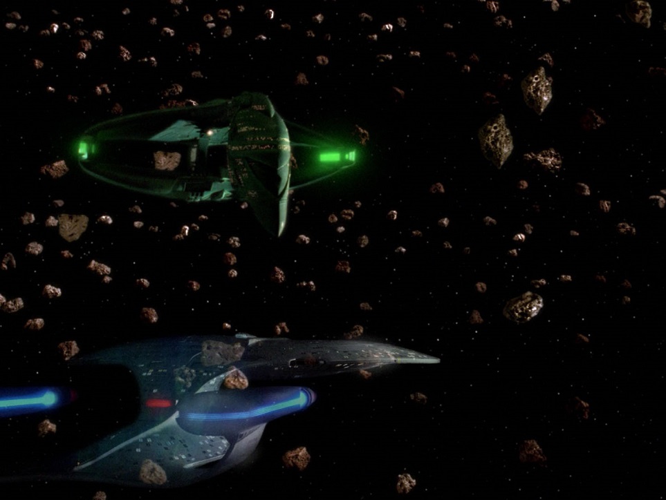 Plot A and B Analysis:  In one of the more famous teasers, this episode begins with Captain Picard day! An admiral diverts the Enterprise to pick up Admiral Pressman, Riker’s first captain when he served on the Pegasus. Evidently “she’s still out there, and the Romulans have found her.” Plot A is about the Pegasus, there is no plot B. The ship–a prototype vessel–was lost 12 years ago, presumed destroyed. Since it was carrying “experimental technologies” they can’t let it fall into Romulan hands. We learn about a mysterious experiment, and Riker is shocked to hear that Pressman intends to try again if they find the ship. He gives Riker strict orders to keep Picard in the dark about it. They and the Romulans are searching for the Pegasus in an asteroid field. We find the Pegasus but have to circle back later so as not to tip off the dirty Rommies–during that time Picard grills Riker in his quarters and learns the crew of the Pegasus mutinied against then-captain Pressman. Riker clams up, under orders. Later Pressman overrides Picard, the big jerk, and orders the Enterprise herself into the asteroid despite the danger to the ship. Finding the Pegasus somewhat intact, Pressman only allows Riker to accompany him onboard. Riker talks some smack while there, and upon returning learn the Romulans have sealed the Enterprise in the asteroid! Riker spills the beans on Pressman’s device, and the Enterprise cloaks and phases through solid rock. Picard reveals the ‘phasing cloak’ to the Romulans and arrests Pressman. Picard and Riker hug it out, and this episode is over.