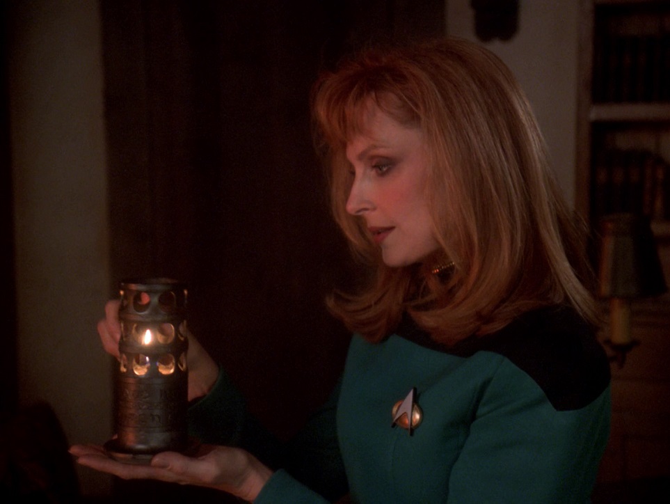 Behind the Scenes/Trivia: This is the final episode of the series that does not bear a stardate. What did Gates think of this episode? At a convention she said, “I was basically in love with a lamp! This woman is a doctor and falls in love with a lamp! How the hell does that work?” Jonathan Frakes directed it, his eighth and final episode. You may have forgotten that Beverly’s grandmother was first mentioned way back in The Arsenal of Freedom, where Felisa learned to use herbs and roots following a major disaster, so the writers did remember her.