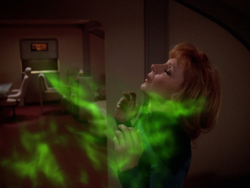 Plot Synopsis: Beverly Crusher attends her grandmother’s funeral, but a mysterious (and pointless) entity that inhabited her grandmother is now focusing on her.