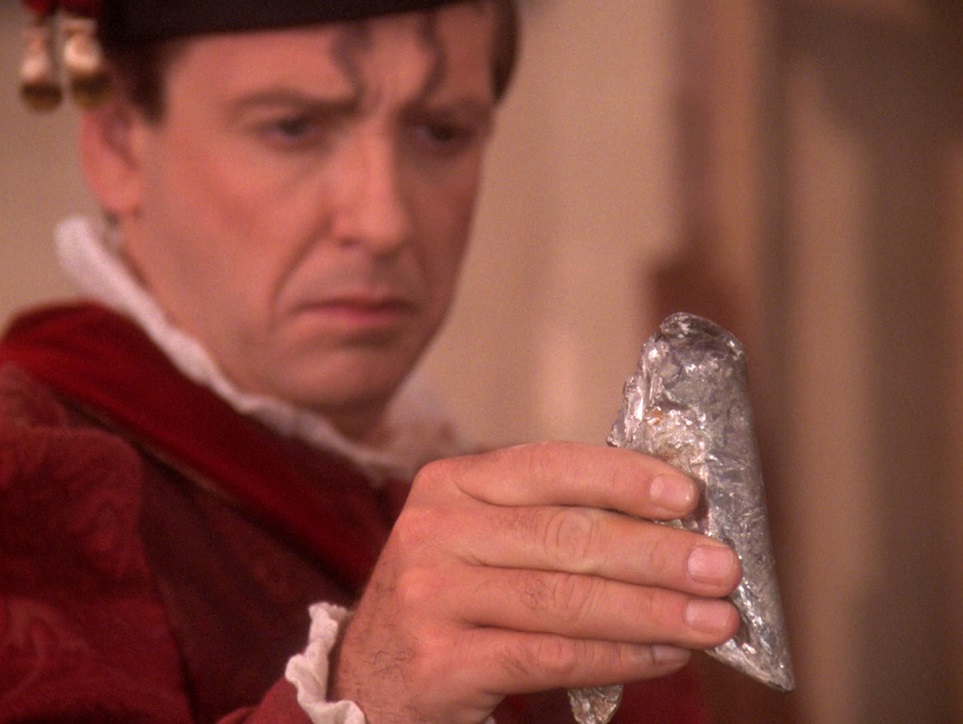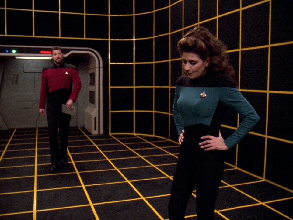 Use of Cast/Characters: Patrick has the least in maybe the entire series: just one line at the end. Riker plays the trombone and administers the bridge officer’s test for Deanna, which causes a little friction. This is a Data episode more than anyone else’s, so he is front and center. He’s fairly sympathetic and certainly brilliant, but we don’t really get any character development from him. Deanna is the second major player and has significant character development. She develops in a way that’s nice to watch, and is promoted to full Commander. Beverly stimulates Deanna’s interest in the teaser and brings Data back to life, so that’s something. Geordi and Worf only appear on the holodeck as part of a simulation, and the holo-Geordi dies! There are four guest stars, and they all do reasonably good jobs. Talur is the most interesting character, progressing from a know-it-all to an actual ally.