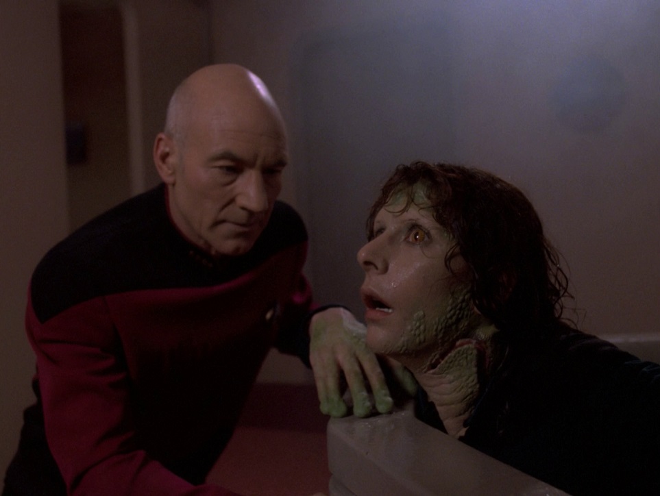 Use of Cast/Characters: Picard and Data get more or less exclusive screen time after the 20 minute mark, and take turns contributing to solving the problem. I do like that, it’s not just Data doing everything. The rest of the crew are used early on as themselves, and in the latter half as monsters. The only potential development that occurs is Worf and Deanna spending more time together, which has been developing since Parallels. Last episode they got together in Troi’s mind, this time he marks her by biting so hard she needs stitches. Ain’t love grand? As we wrap up, Beverly admits that “in a way” what happened was her fault, but let’s be clear–it is directly her fault! Geordi gets the least, he just has a couple of brief scenes and doesn’t de-evolve into anything.