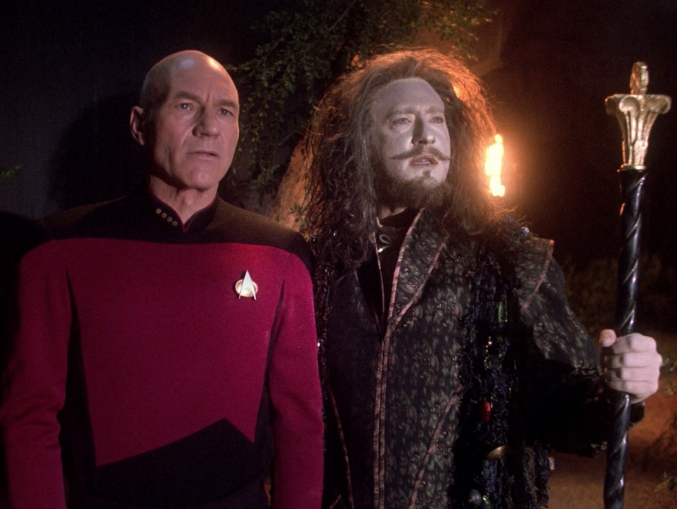 Use of Cast/Characters:  This is something of an ensemble episode. Picard, Data, Troi and Geordi all contribute to the unraveling of the mystery (anemic though it is), and the resolution. I suppose there’s a little character development, as we see Data doing Shakespeare for the last time. It is no accident that the play was The Tempest. It’s the last play of Shakespeare, and Prospero represents the end of an age–so it is with Next Generation. Worf, Beverly and Riker don’t do as much, but they are involved in the episode as well. Thank goodness we learn that after this birth the Enterprise’s intelligence ‘dies’, so we don’t have to deal with it again. There are at least four guest stars and their performances are of varying quality, but none particularly impressive or memorable.