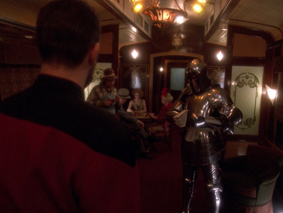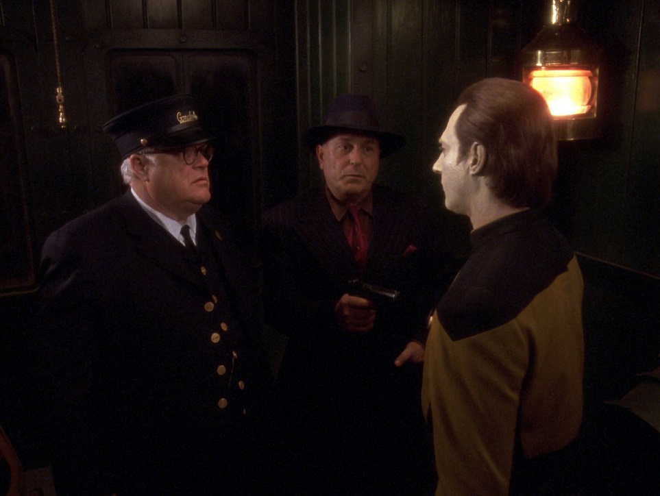 Plot A and B Analysis:  The teaser opens with Data playing Prospero in a scene from The Tempest, then they almost get run over by a train. Plot A is about the “emergence”, there is no plot B. The Enterprise is scouting for new Federation colony sites. For no reason the ship enters warp then goes back to impulse without any explanation, which somehow saves all their lives. Geordi and Data find new circuit nodes throughout the ship and can’t get to any of them, but they all connect to a holodeck. Riker, Data and Worf enter to find themselves on the Orient Express, and after a weird time where an engineer gets shot, they leave when they are threatened. Data puts this nonsense together: “I believe the Enterprise may be forming an intelligence.” A bunch of metaphorical things occur on the train, there’s a stop at Keystone City where a mafioso puts a brick in a wall, then some kind of object forms in the cargo bay. There are themes of a puzzle being put together, a foundation being laid, and the crew eventually figures out the Enterprise is trying to procreate. They get to a white dwarf star but it doesn’t have enough juice to power the new life form, so between Picard and Geordi they generate an artificial source of vertion particles, and let the new life form develop and leave into space.