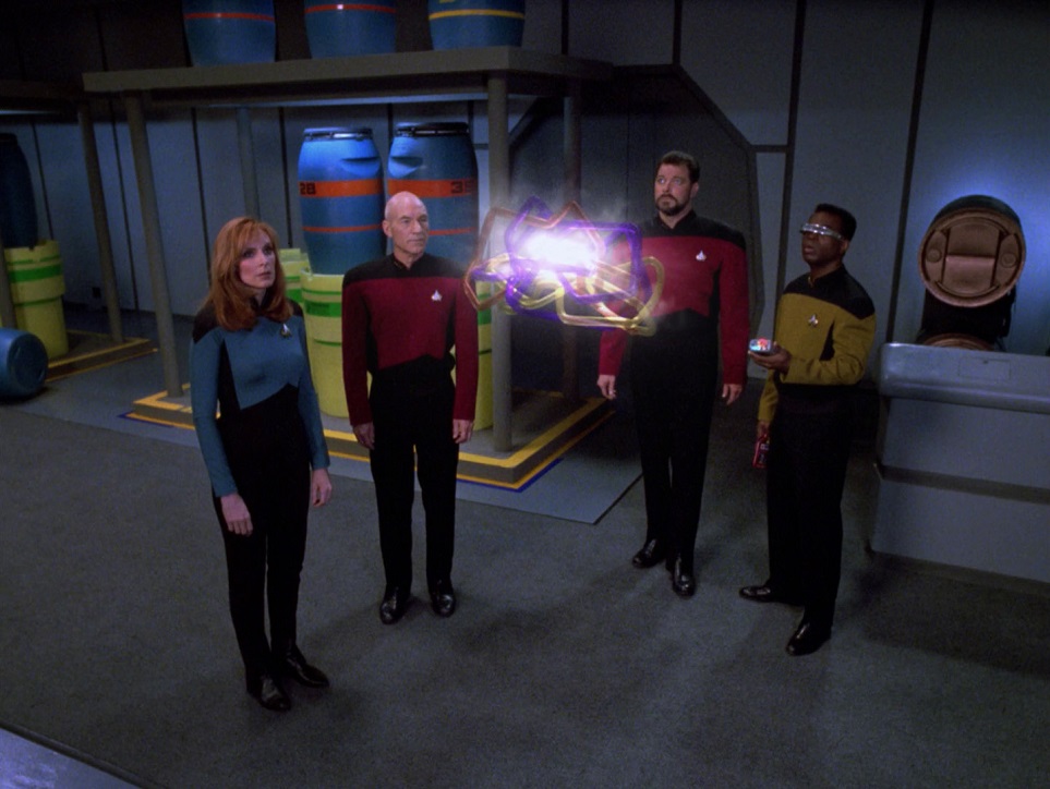 Nitpicks:  In the teaser Data increases the torchlight by 20%, but it’s pretty obvious it more than doubles. I’m not a fan of simply having Data explain everything, then Geordi explaining everything, and later on Troi explaining everything. Exposition to the audience isn’t my favorite way of moving an episode forward.