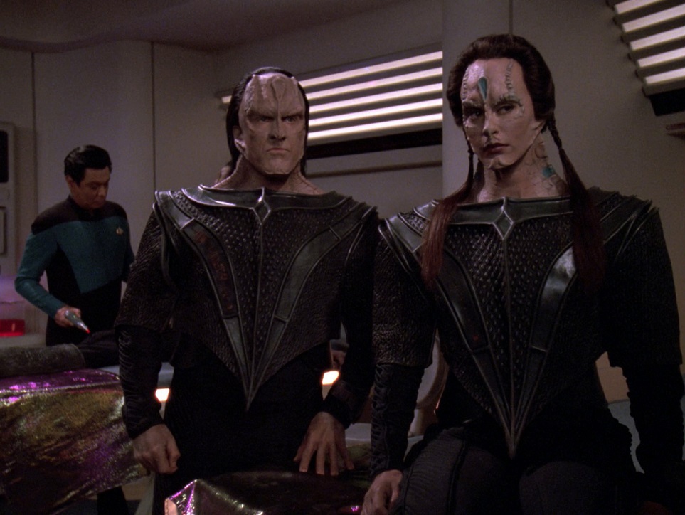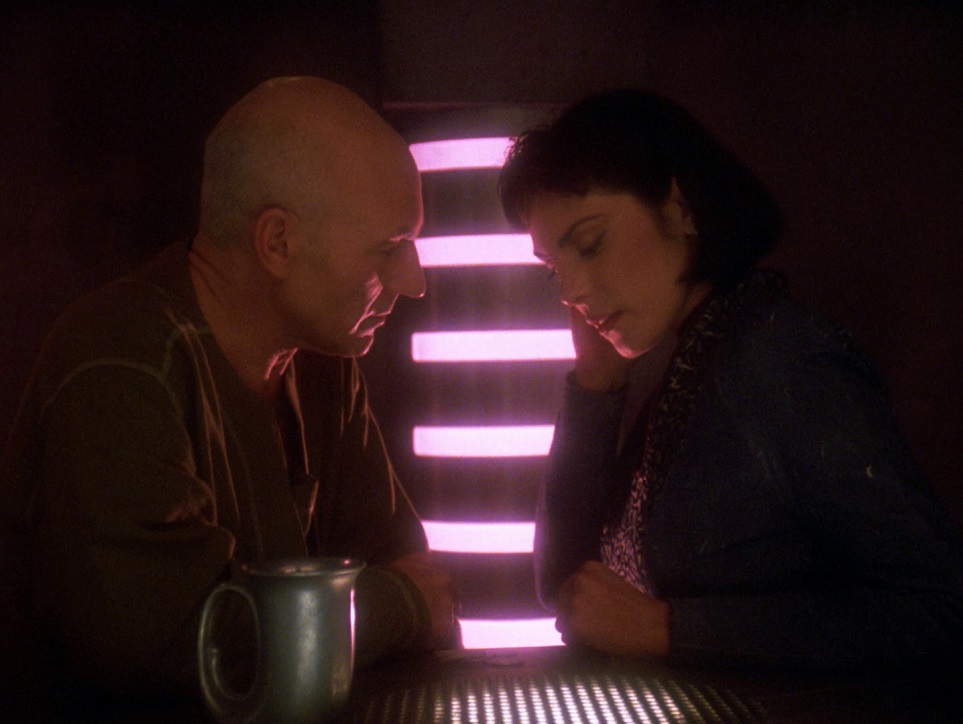 Plot A and B Analysis: The teaser sees the return of newly-promoted Lieutenant Ro, after graduating from advanced tactical training. Ro gets mushy with Picard, saying “If it weren’t for you, my life would be a very different one right now.” They are both called to the bridge to find a Cardassian ship under attack by the Federation! Plot A is about Ro and Maquis, there is no plot B. Actally the Cardies are being attacked by multiple Maquis ships–federation-born freedom fighters–but the Enterprise scares them away. Tensions are high in the DMZ between Federation and Cardassian space, and Admiral Nechayev plans to use Ro to infiltrate the Maquis–she agrees primarily to justify Picard’s faith in her. It doesn’t take long, she gets recruited. The Maquis hear the dirty Cardies in the DMZ are obtaining biogenic weapons to wipe them out, and decide to make a preemptive strike against them. Ro volunteers to steal some medical supplies from the Enterprise on a Maquis ship to earn her street cred. Later, Picard fills Ro in on the plan: they’ll lay a trap and when the Maquis come to get the ‘weapons’ the Federation will swoop in and get the whole organization. Ro agrees, but when father-figure she’s grown close to in the Maquis is killed in a Cardassian attack she tries to get Picard to abort the mission. Instead he sends Riker back with her to babysit but it doesn’t stop her from betraying the Federation by sabotaging the mission, and the episode ends with Ro joining the Maquis.