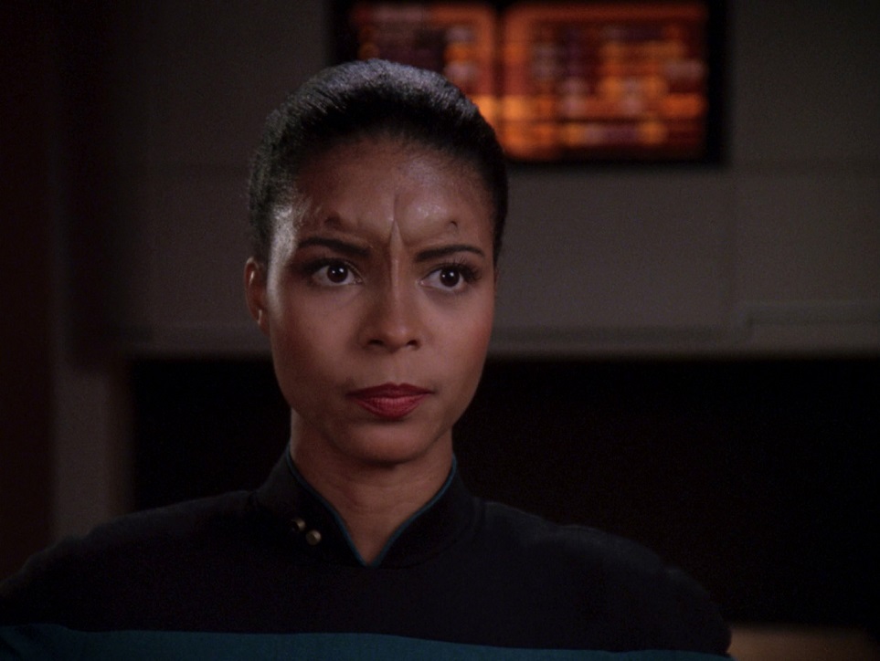 Use of Cast/Characters:  At this point Picard knows how to handle Klingons. When the governor gets all grumpy and defensive Picard just apologizes and mentions Gowron’s name, which eases the way considerably. Other than this he doesn’t do much. Riker investigates the mystery, and he is involved but gets no character development. Deanna has one word to say in the episode (“Concerned?”), Data has two lines. Worf does a little, but other than one nice line he doesn’t have much. This is Geordi’s episode, and his main roles are investigating the logs and developing a love interest in Aquiel. It is implied he sleeps with her. Beverly investigates her mystery, which is the cellular residue, and is instrumental in solving it which is nice. Renée Jones plays Aquiel and sums up herself in two lines: “I’m not a model officer, I realize that. Sometimes I act on impulse instead of thinking things through.” She does a decent job overall, but there isn’t much chemistry between her and Geordi. The forgettable Klingons are jerks in this episode.
