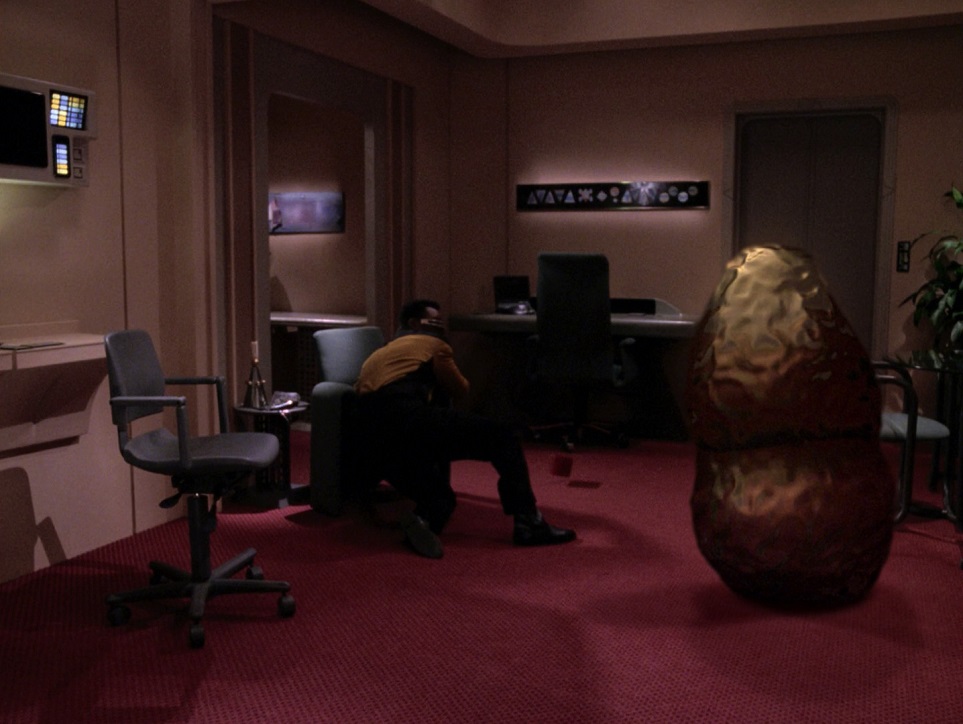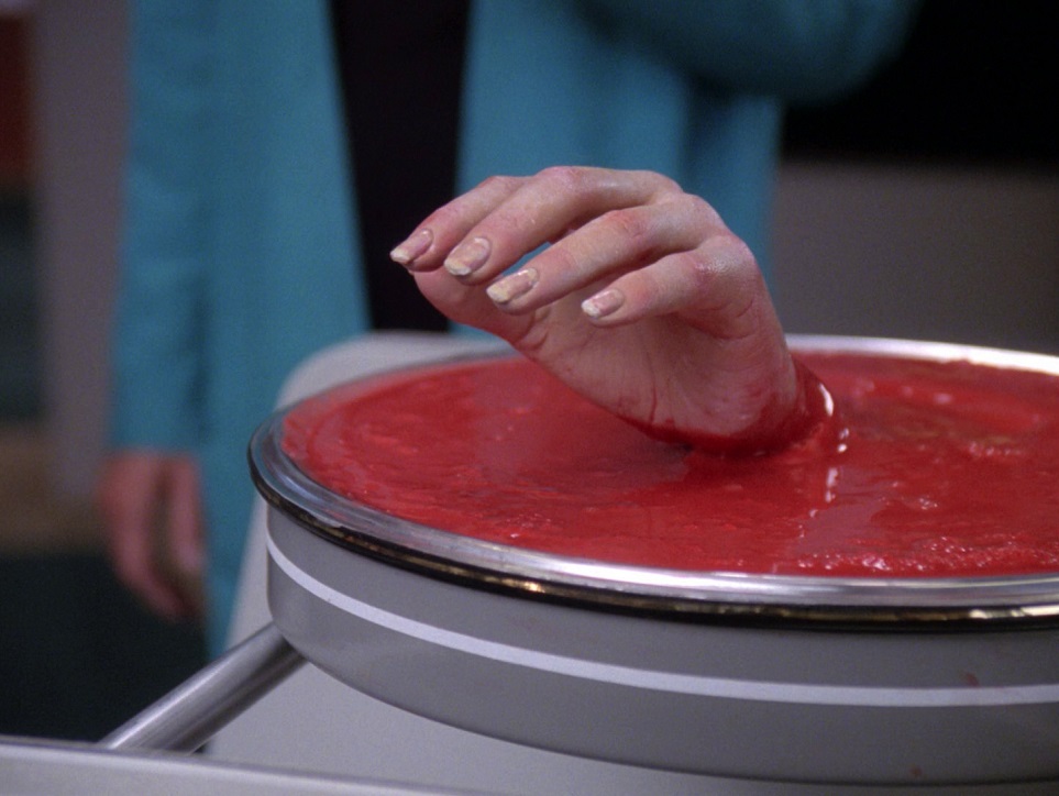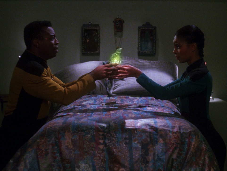 Favorite Scenes:  I’m usually very good at remembering lines from individual episodes, but there are only two I remembered from this one. The first is that Aquiel had ‘”questionable taste in literature.” The other quote is from Worf when he’s fed up with the Governor’s posturing and says disdainfully, “Have the courage to admit your mistakes.” I do remember that weird pink gel turning into Beverly’s hand, it was nice and weird.