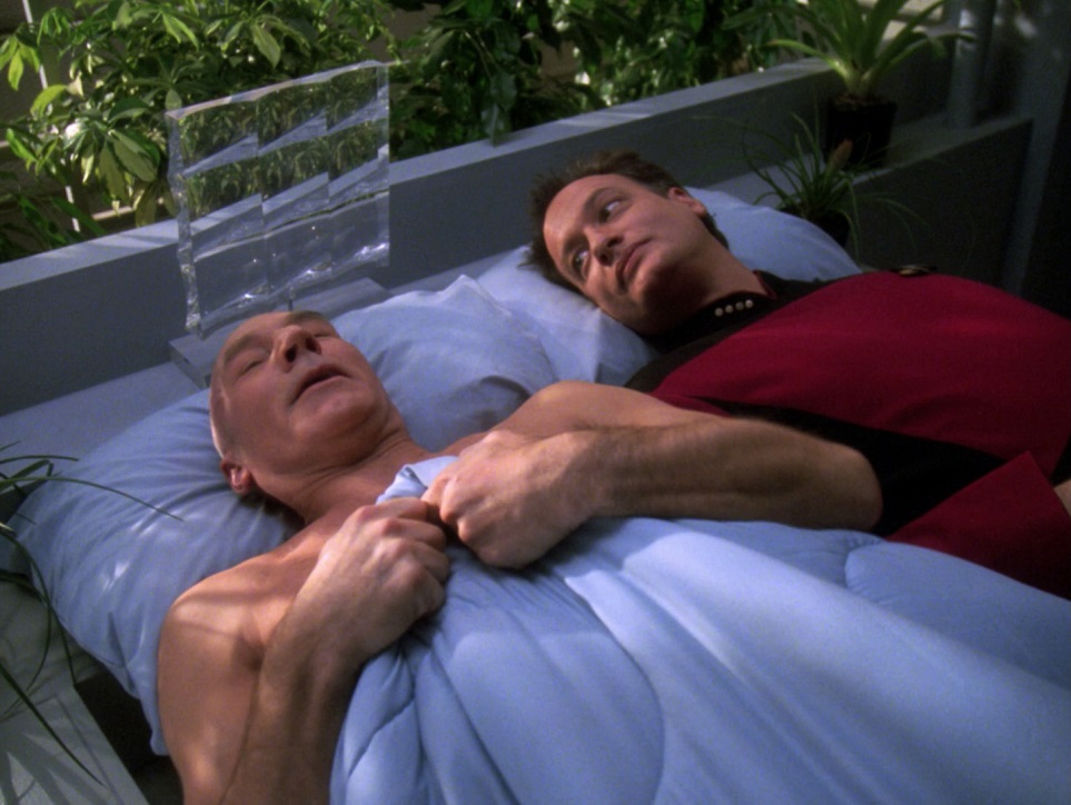 Use of Cast/Characters:  This is Picard’s episode, and it’s one of his best. What he learns and what it means to him can be summed up by his line, “I would rather die as the man I am than live the life I just saw.” He even meets his father, who was disappointed in him for joining Starfleet. With this episode and Where No One Has Gone Before, we’ve met both his parents. Talk about character development. This not an ensemble episode at all, however. Riker and Troi have one scene with ‘lieutenant Picard.’ The others, including Data, Beverly, and Worf get almost nothing. Geordi doesn’t even appear in this episode, he just gets one voice-over line. Ned Vaughn and JC Brandy play Cortan and Marta respectively and are good.
